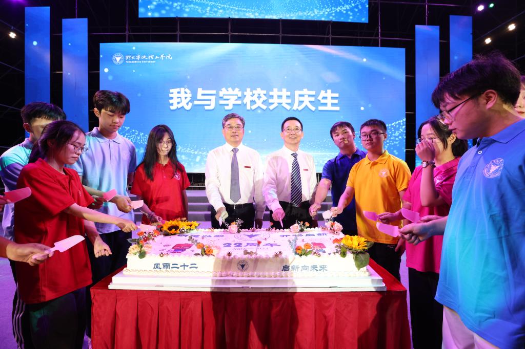 现场师生共同为学校庆祝生日,党委书记徐方、校长杨德仁院士为新生代表佩戴校徽,和校庆同生日的萌新们一起,切开生日蛋糕许下祝福,现场新生一同戴上校徽,共享“浙大宁理人”的荣耀。