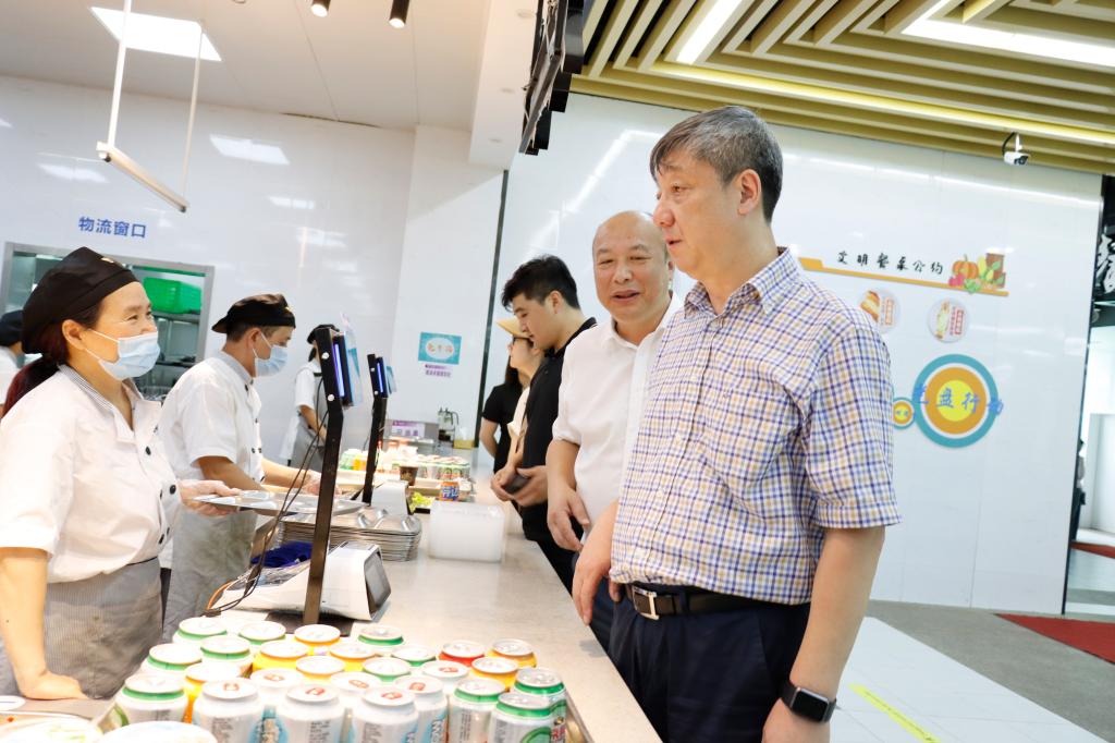 胡征宇一行先后来到门岗、食堂等后勤保障场所和教学区、生活区、石麟大楼等施工现场,慰问奋战在一线的后勤、保卫、施工人员,向大家表示感谢,为他们送上饮料、毛巾等防暑降温物品,叮嘱大家做好防暑措施,合力保障假期校园平稳有序;走进施工现场,实地查看了解作业环境、项目进展和安全设施维护情况。胡征宇指出,今年的修缮工程范围广时间紧任务重责任大,各单位要强化协同,合理规划,加强师生的提醒引导和施工的监管督导,保障餐饮卫生和施工安全,坚持安全和有序两手抓,尽可能减少对在校师生学习和生活上的影响。他强调,夏天是台风等恶劣天气环境高发季节,各单位要树牢安全意识,守好安全底线,在保障施工安全的前提下,科学安排、规范施工、加强管理、盯紧进度,确保工程质量,努力建设师生满意的精品工程。