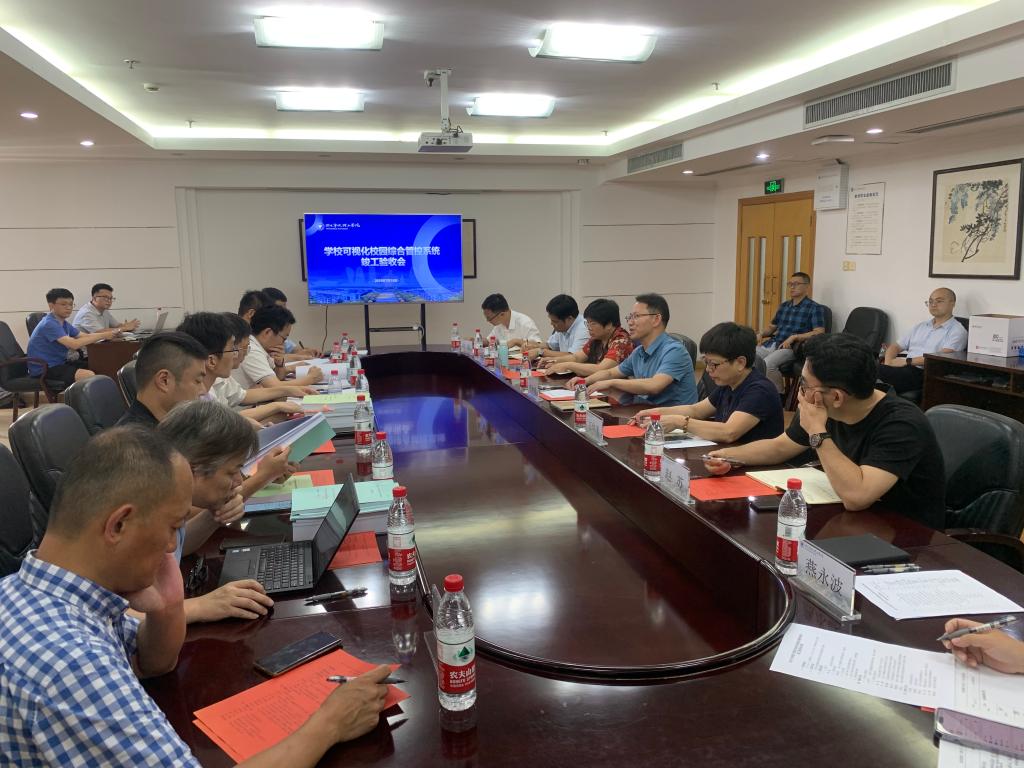 供应商华信咨询设计研究院有限公司对项目建设内容、运行情况等进行整体汇报。验收小组现场查看验收资料、演练操作系统、实地勘察设施设备。专家一致认为本项目建设思路和展现效果具有前瞻性,软、硬件建设已达学校招标合同要求,同意项目通过验收。