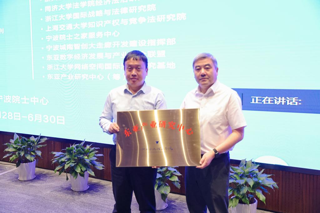 会上还举行了东亚产业研究中心揭牌仪式。该研究中心由浙大宁波理工学院发起建设、面向广大学界、业界专家开放共享的平台。章献民向研究中心主要承建单位——学校传媒与法学院副院长王军伟教授授牌,并为程乐教授颁发研究中心首席专家、执行主任聘书。