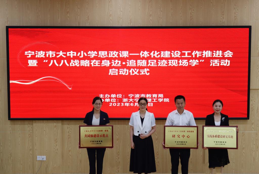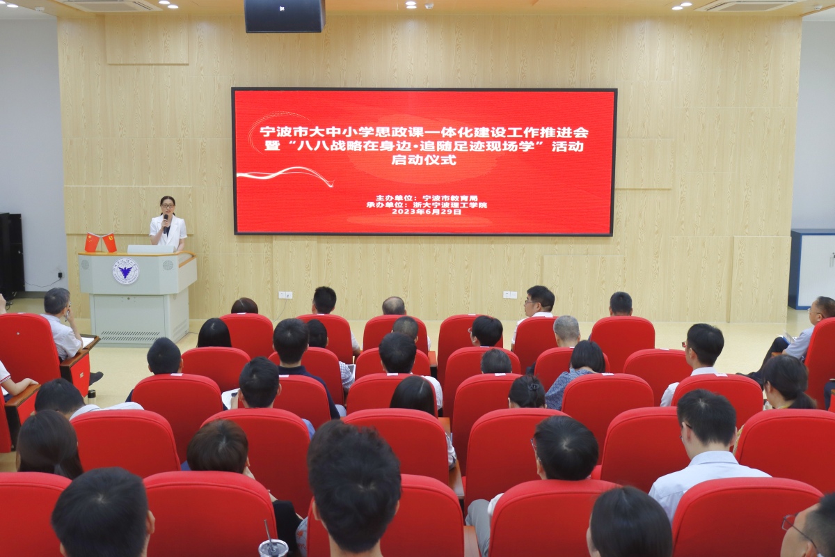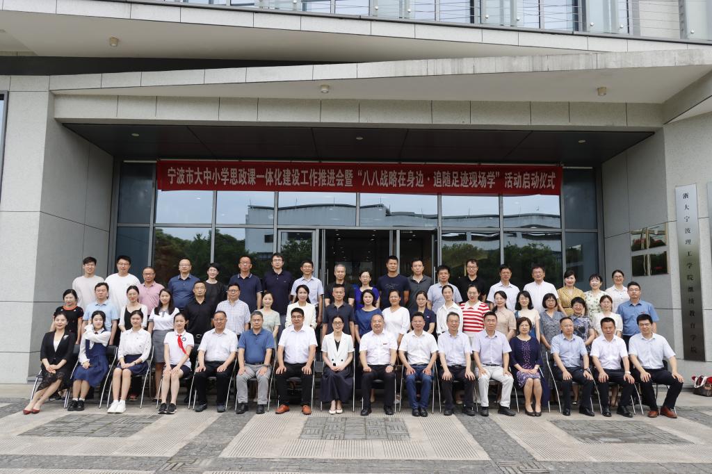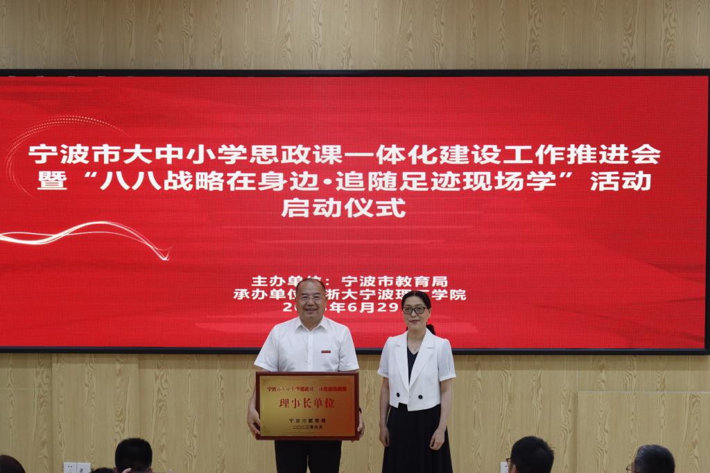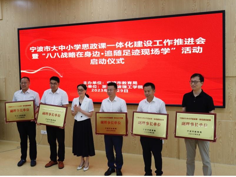 为深入学习贯彻习近平总书记关于思政课建设的重要论述,扎实推动大中小学思政课一体化建设,切实提升思政课教育教学质量,全面增强思政育人实效,6月29日,宁波市大中小学思政课一体化建设工作推进会在我校学术交流中心101会议室举行,宣布宁波市大中小学思政课一体化建设联盟成立,我校授牌成为联盟理事长单位。市教育局党委副书记、二级巡视员徐文姬出席,学校党委副书记李凤旺代表学校致辞。