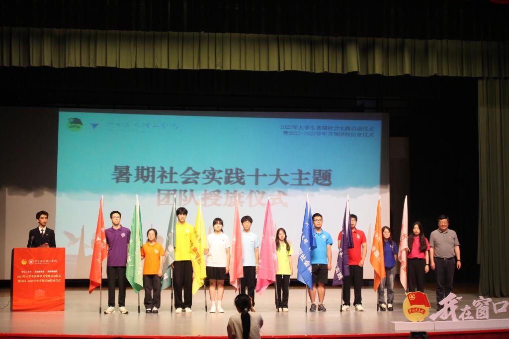 式在庄严的国歌声中正式开始。黄光杰为十大主题团队代表授旗。他指出,大学生暑期社会实践是引导和帮助广大青年学生走进社会体悟国情的重要推进,是上好与国情相结合“大思政课”的重要途径。今年,149个团队、155名教师、2800余名同学整装待发,他对大家提出三点期望:一是牢记使命担当,一颗红心永向党。希望大家通过实践调研增进对中国共产党领导的信任,坚定共产主义信仰,自觉将个人奋斗方向与党和祖国的要求结合起来,为中华民族伟大复兴的中国梦不懈努力。二是贯通历史未来,一颗恒心做实践。希望大家坚持理论联系实际,紧密结合自身专业背景,用自己的真实情感和实际行动,一丝不苟地完成所有实践任务,在服务群众中奋进,在奉献社会中升华。三是书写光荣梦想,一颗实心肯吃苦。希望大家勇于走在时代的最前沿,以大无畏的闯劲、甘于吃苦的韧劲、不断求索的干劲,主动承担起时代赋予的光荣使命,努力在社会实践中,成就自我、奉献社会。