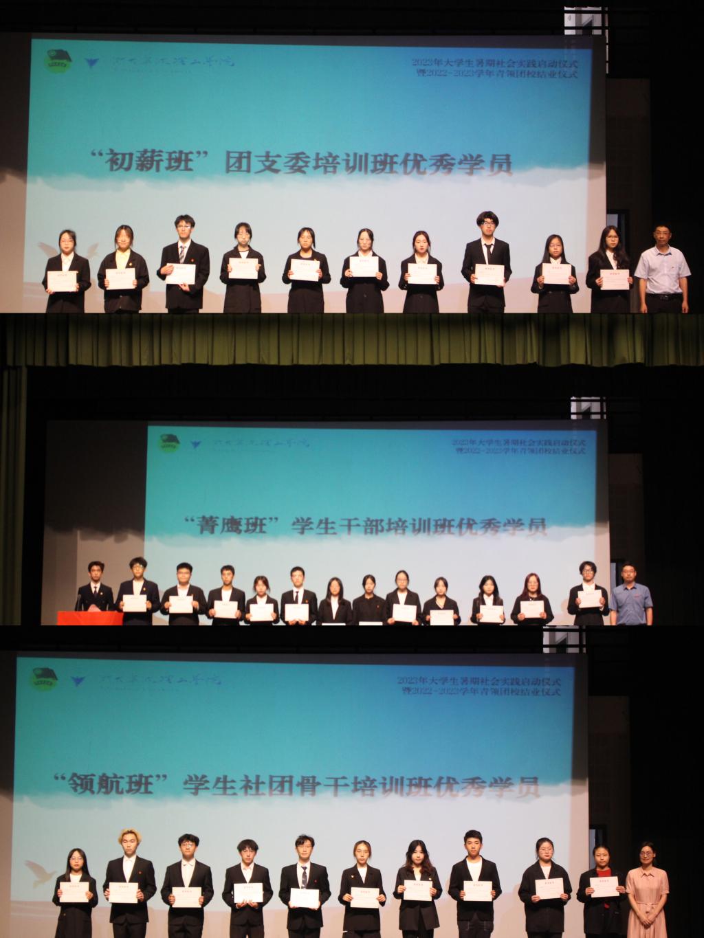 出征仪式上,还举行了2022-2023学年青领团校结业仪式。自去年“初薪班”“菁鹰班”“领航班”学生骨干培训班开班以来,全校466名新生团支委、207名校级组织学生干部、176名学生社团骨干顺利结业。会议公布了优秀学员名单并为优秀学员代表颁奖,领航班“转型中国读书会”学生负责人李银月作为优秀学员代表发言。