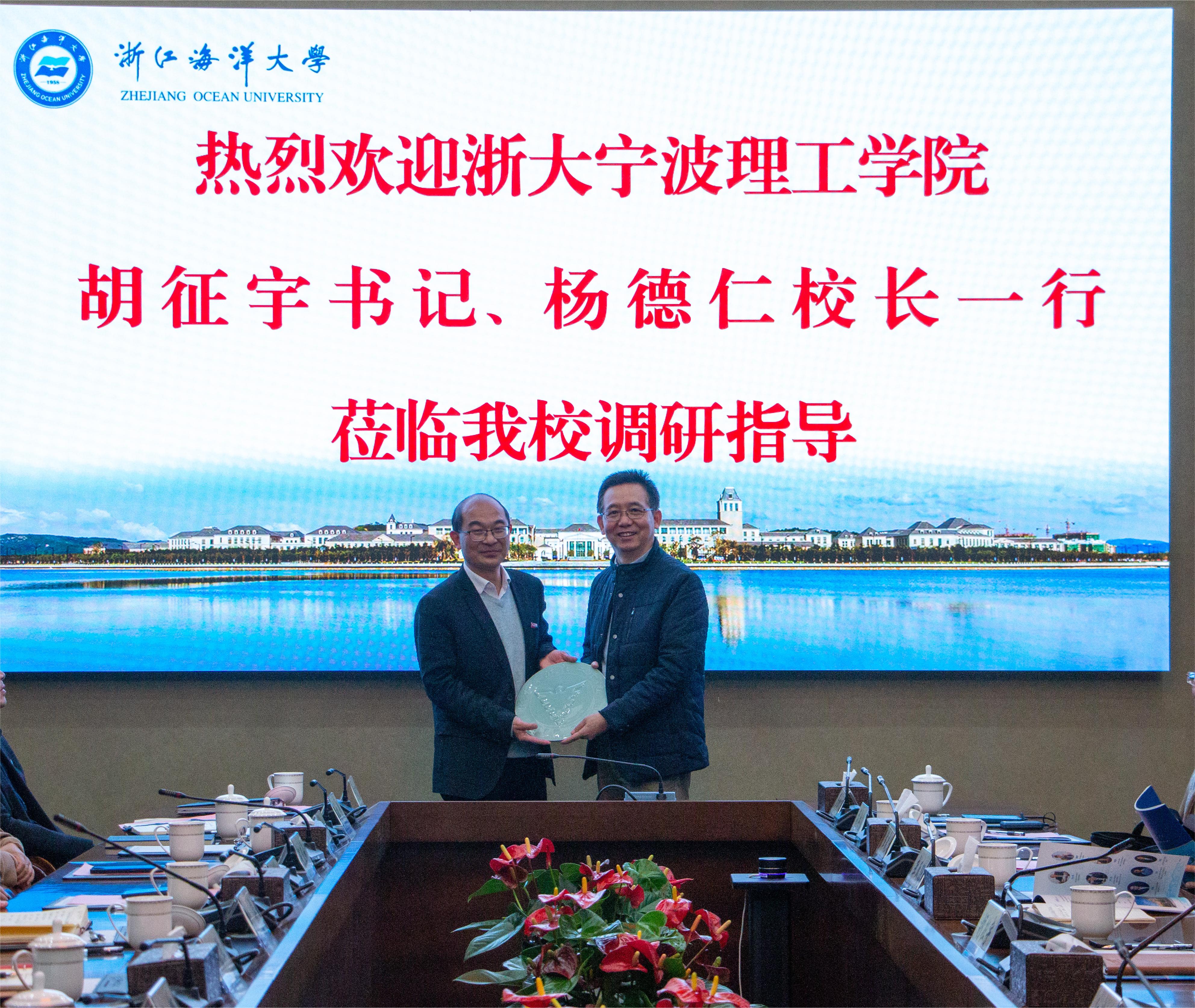 杨德仁代表学校向浙江海洋大学赠送纪念品。他表示,浙江海洋大学办学历史悠久,特色明显,在海洋领域取得了一系列优秀成绩;长久以来,两校睦邻友好、渊源美好,有着紧密联系和牢固的合作基础,希望彼此通过交流,加深了解,在今后的校际合作中优势互补,共创佳绩,以科技赋能我省“两个先行”。