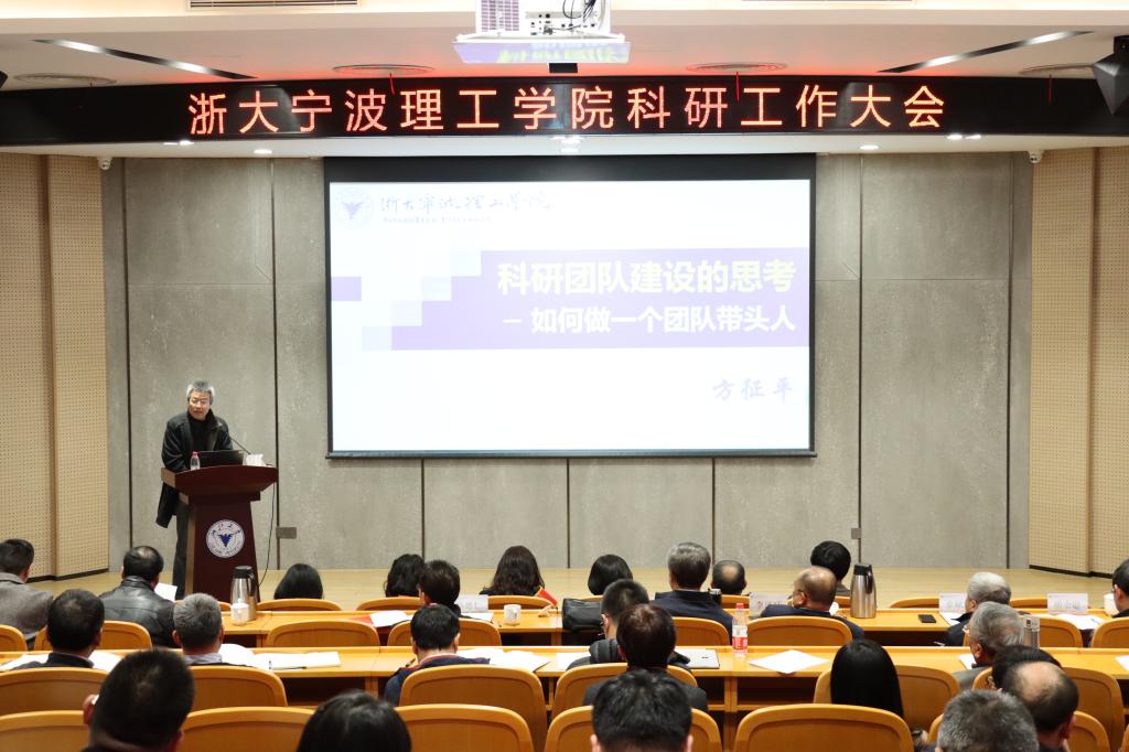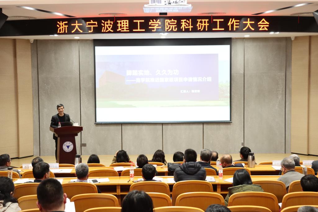 校长杨德仁讲话。他指出,时隔三年,学校再次召开科研大会,目的是贯彻落实党和国家战略部署,分析形势、深化交流、凝聚共识、明确目标、部署动员,全面推进有组织的科研,不断取得学校科研工作高质量发展新成效。他表示,过去三年学校在经历转设、变换赛道的过程中,持续深耕内涵建设,科研工作取得了积极成效、打下了很好基础。杨德仁强调,一分部署九分落实,在推进学校科研攻坚计划过程中要坚持服务国家战略、突出立足宁波导向,着重把握好三个方面,一是要以有组织科研为抓手搭建平台,依托平台组建团队并长期持续攻关,重点围绕《科研攻坚“135”三年行动计划》,实施三大攻坚工程和五大支撑工程,着力加快科研范式和组织方式变革、加大科研政策支持力度、加强科研成果培育和转化。二是要凝聚各方面力量,坚持“学校布点、学院建点、学科团队蹲点”三级联动,多方携手提升科研效能。三是要积极拓展外部资源,加强与政府部门、高水平院所合作,深化与行业龙头、“专精特新”企业对接,构建高精尖科研资源圈赋能学校科研生态。
