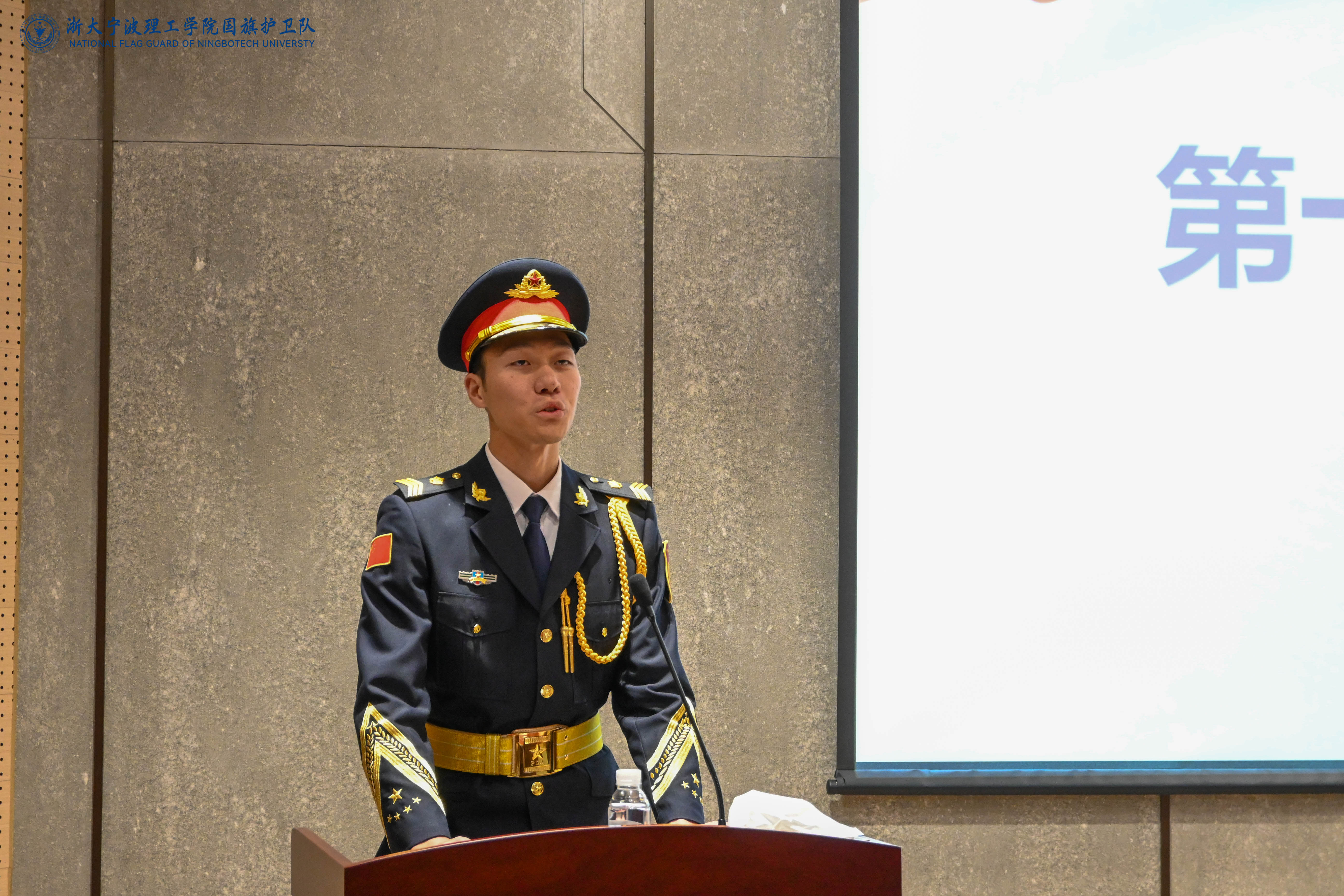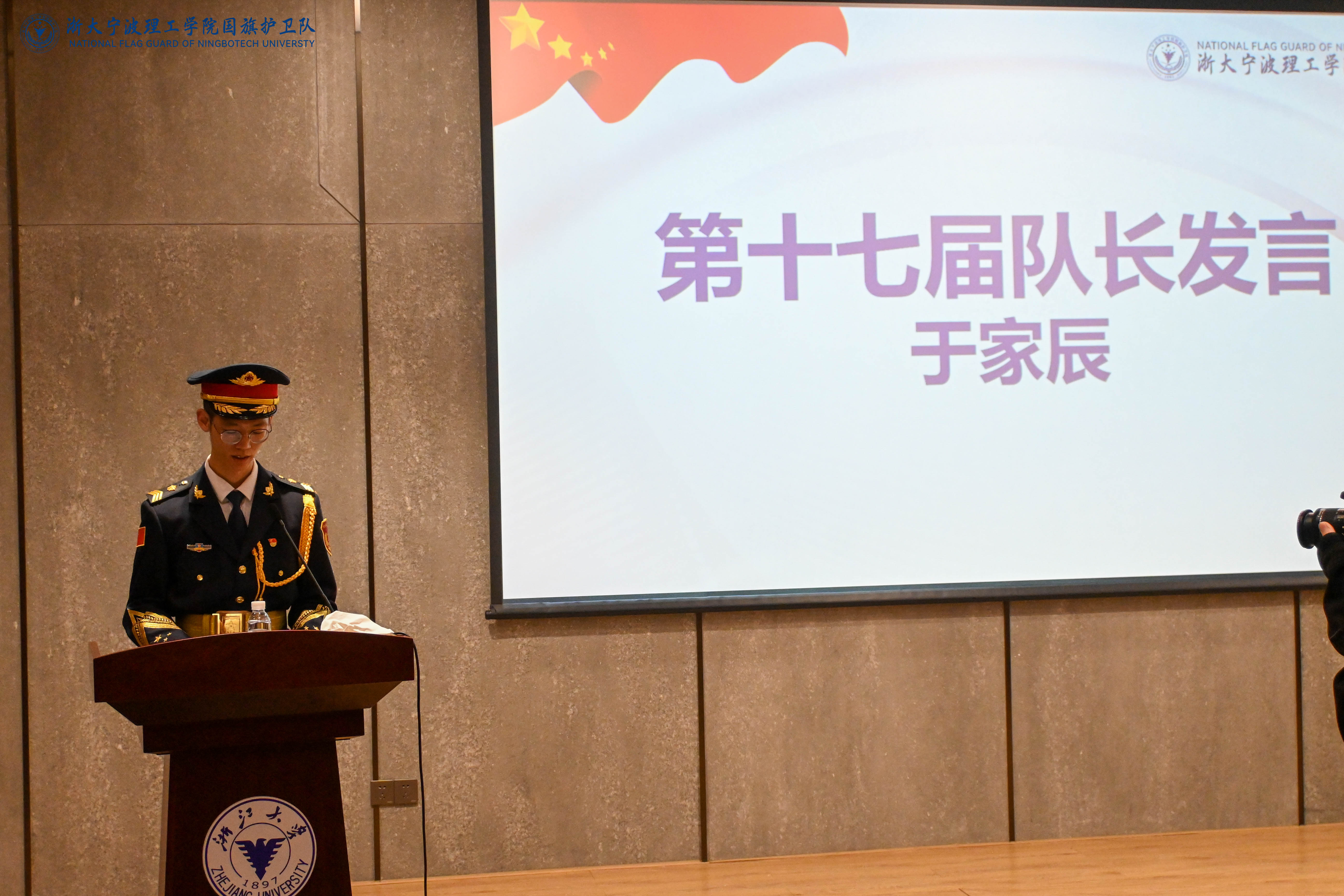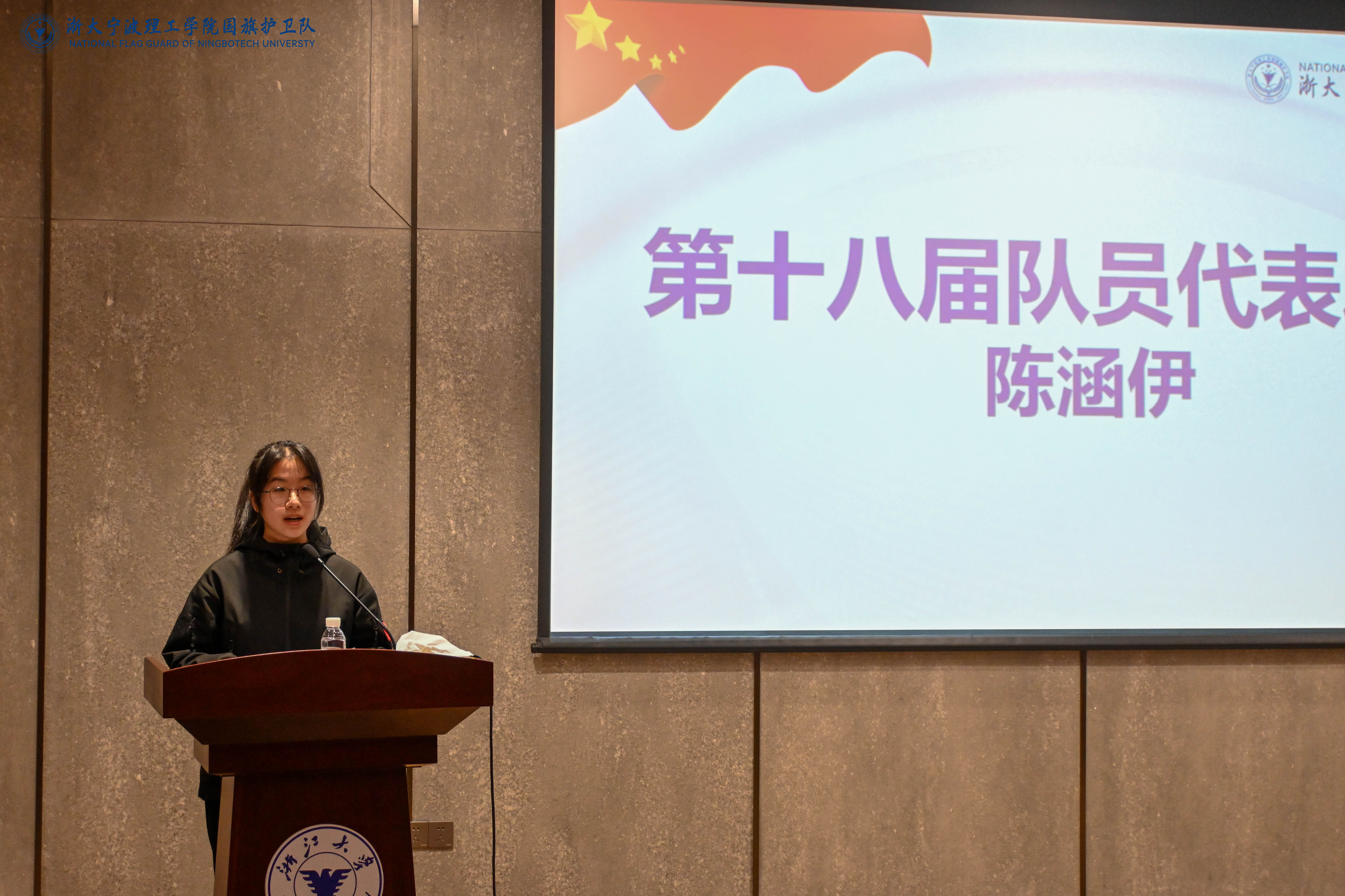 袁乐表示一定会继续团结队员,改进工作,牢记“团结护旗,矢志报国”队训,让爱党爱国的红色传统在队内永续弘扬!执行队长代表项可菡表示,将带好每一次训练、完成一次任务,刻苦奋斗,矢志不渝。新队员代表陈涵伊讲述了入学以来在国旗队的心得体会,从踢腿、走正步、走齐步的队列训练,到学长学姐都的细心指导。她表示,全体新队员们将扛起新的使命和责任,守护国旗荣光。