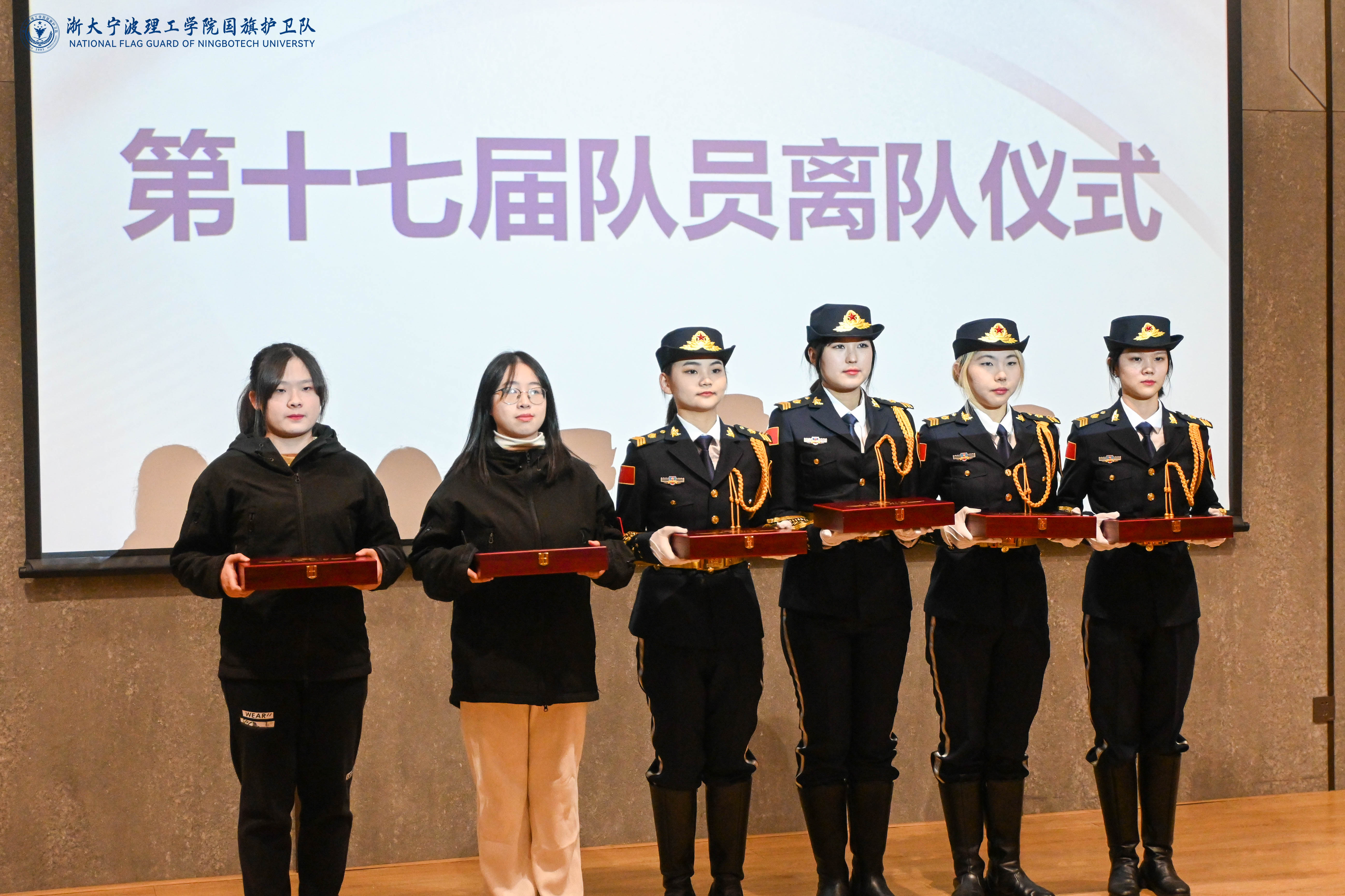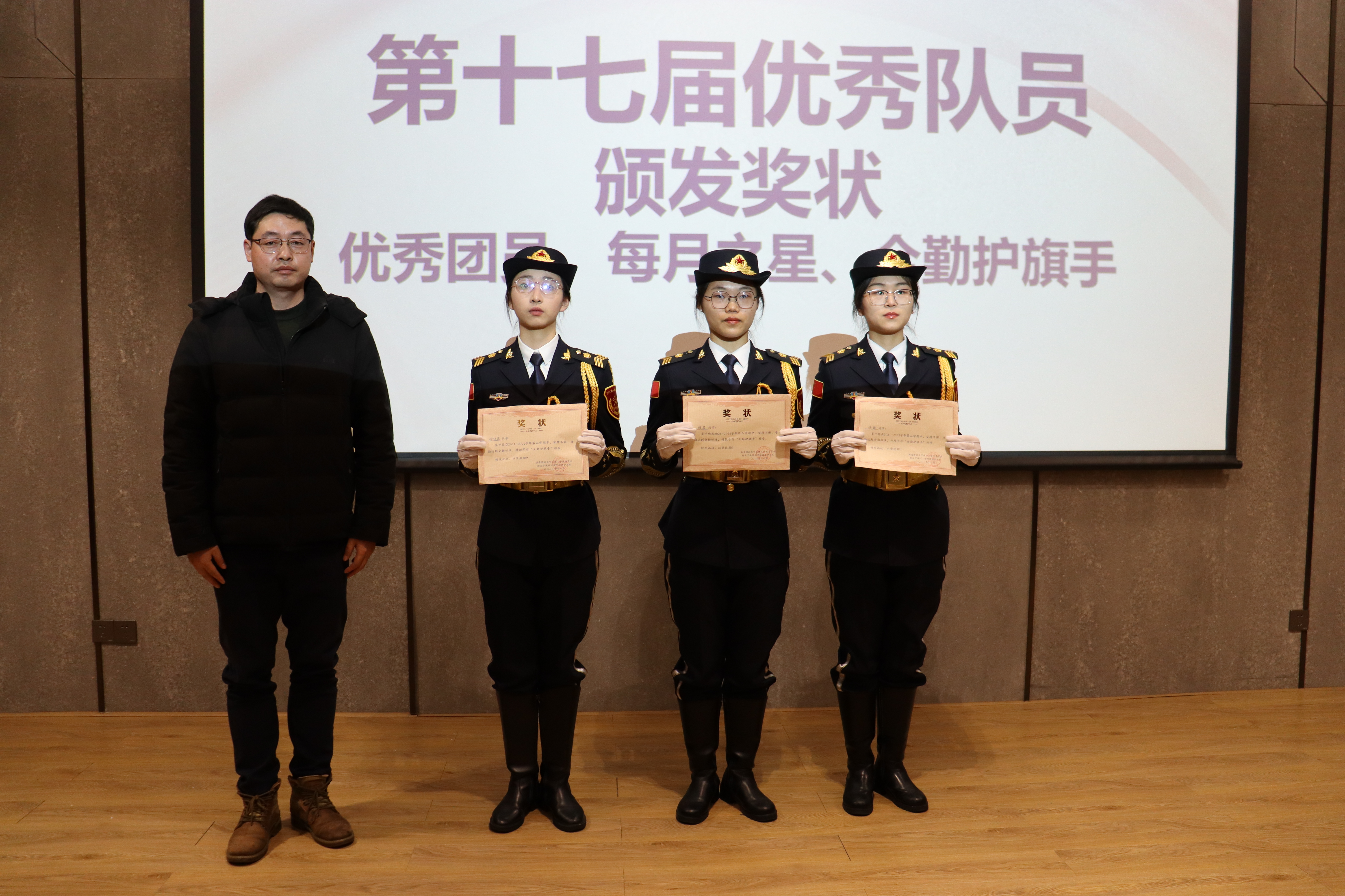 “你们曾看过第一缕晨曦的阳光,也见过深夜里闪烁的星河,去往旗台的每一寸道路都是你们的青春足迹。”离队仪式上,第十七届国旗护卫队队长于家辰发言,汇报了国旗队2021-2022年度的工作重点和主要成果。李炜为第十七届优秀队员颁发奖状,激励队员们奋发向上。新队员为第十七届离队队员颁发荣誉礼盒及证书,感谢他们这一年里的辛勤付出。第十七届队员代表王易发言,在回忆青春护旗岁月中坚定了未来奋斗的方向。