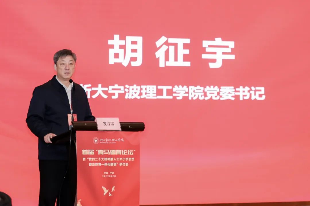 胡征宇向与会人员表示欢迎和感谢。他表示,研讨会聚焦“党的二十大精神”“大中小学”“一体化”等关键词,点题精准,与践行为党育人、为国育才使命高度契合。他讲到,今年也是习近平总书记到我校考察20周年,二十年来,学校认真贯彻习近平总书记来校考察时的重要指示精神,实现高质量跨越式发展。希望学校以本次研讨会召开为契机,为推动宁波市大中小学思想政治教育一体化建设、合力培养中国特色社会主义事业的建设者和接班人提供理论指引和智力支持。