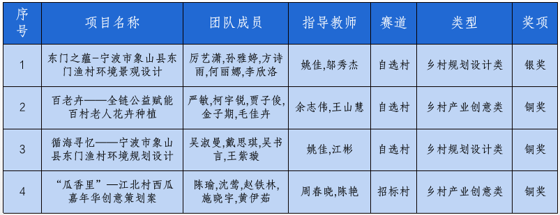 在激烈的竞争中,我校环境设计191班厉艺潇同学负责、姚佳和邬秀杰老师指导的项目《东门之蕴-宁波市象山县东门渔村环境景观设计》进入决赛答辩环节并活的银奖,国际经济与贸易201班严敏负责、余志伟和王山慧老师指导的项目《百老卉——全链公益赋能百村老人花卉种植》、环境设计191班吴淑曼同学负责、姚佳和江彬老师指导的项目《循海寻忆——宁波市象山县东门渔村环境规划设计》、法学204班陈瑜负责、周春晓和陈艳老师指导的项目《“瓜香里”—江北村西瓜嘉年华创意策划案》获得铜奖。