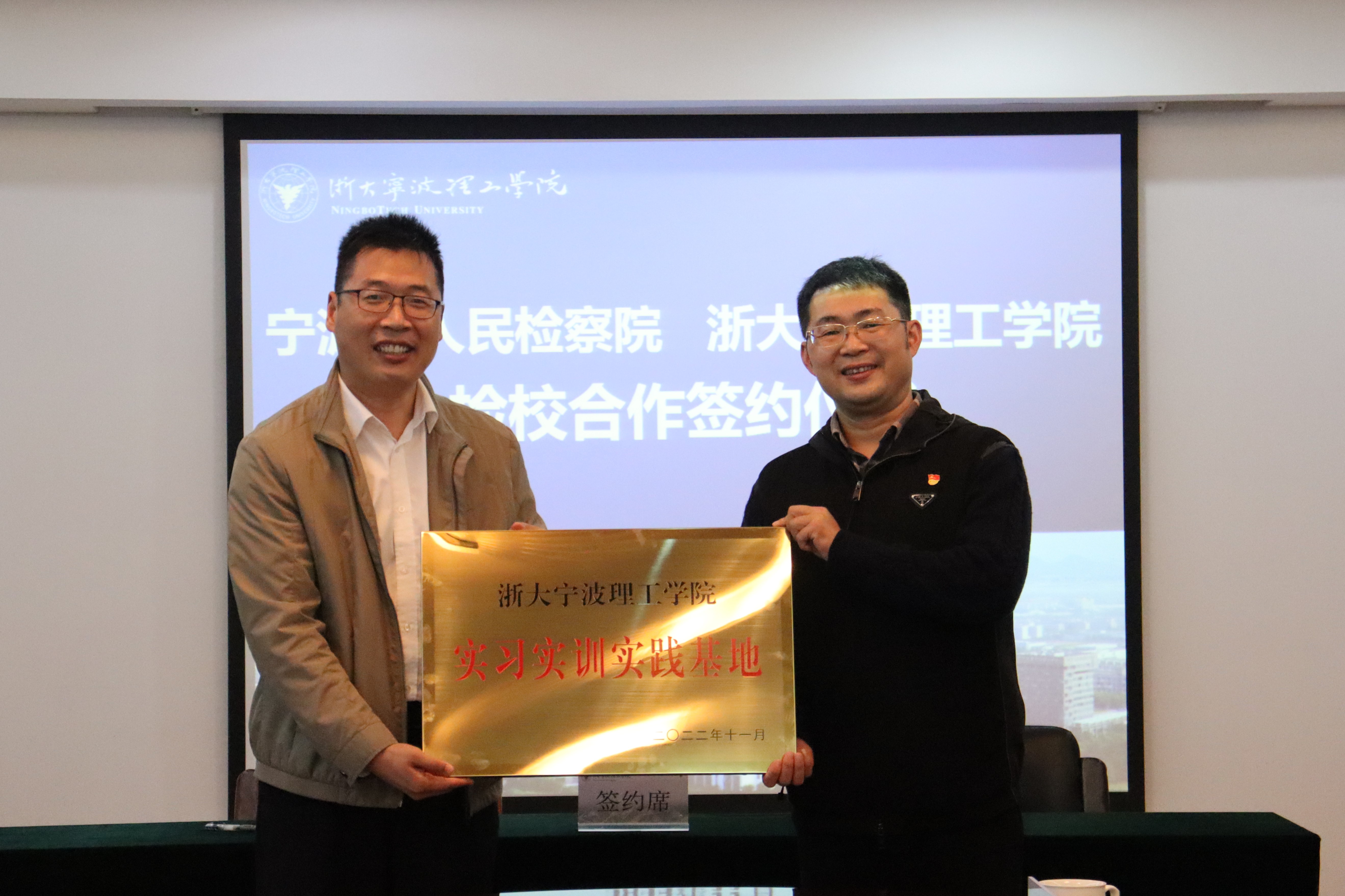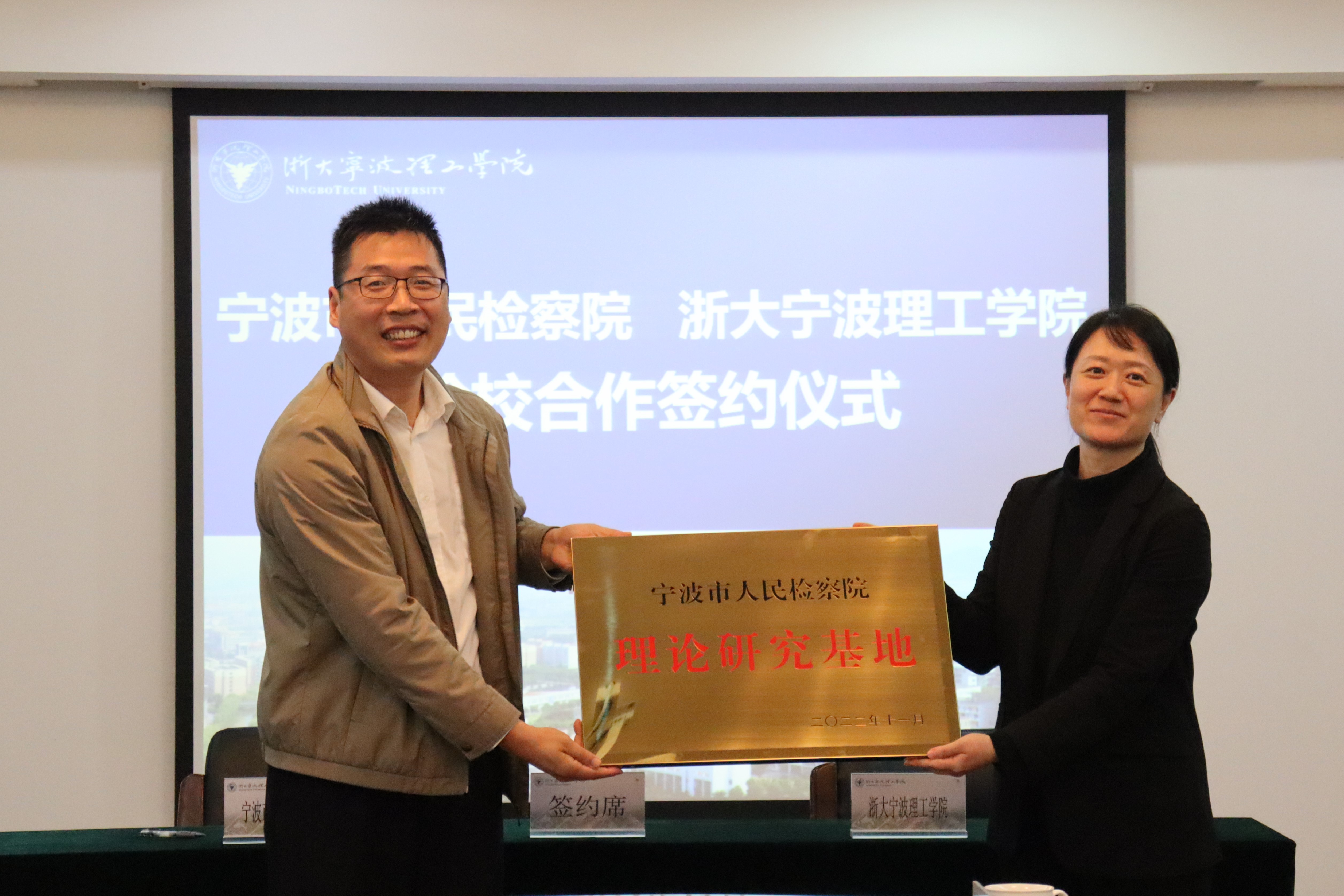 为深入贯彻落实习近平新时代中国特色社会主义思想和习近平法治思想,特别是习近平总书记关于法治人才培养的重要指示精神,创新法治人才培育机制,实现司法实践与法学教育、法律研究的深度融合,打造法律职业共同体,11月17日下午,宁波市人民检察院与浙大宁波理工学院检校合作签约仪式在行政楼602举行。宁波市人民检察院检察长何小华、副检察长吕海庆、法律政策研究室主任仝永涛以及学校党委书记胡征宇、党委副书记冯建波,传媒与法学院教授张利兆、副院长韩缨、党委副书记胡鹿鸣、浙大宁波理工学院启新特聘教授金彭年等参与了签约仪式。活动由金彭年教授主持。