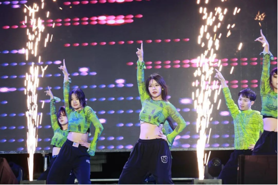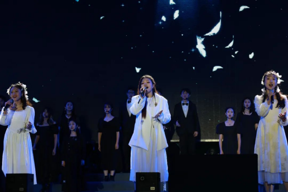 随后精彩纷呈的文艺晚会在细雨中拉开帷幕,晚会分为三个篇章进行。“如愿·灿烂绽放”篇章,以新疆舞《绽放》开场,充分展现了新生们的青春活力。联唱《如愿》《孤勇者》《Hope》《爱你》、相声《学艺》以及街舞《Feast》为师生呈现了一场视听盛宴。