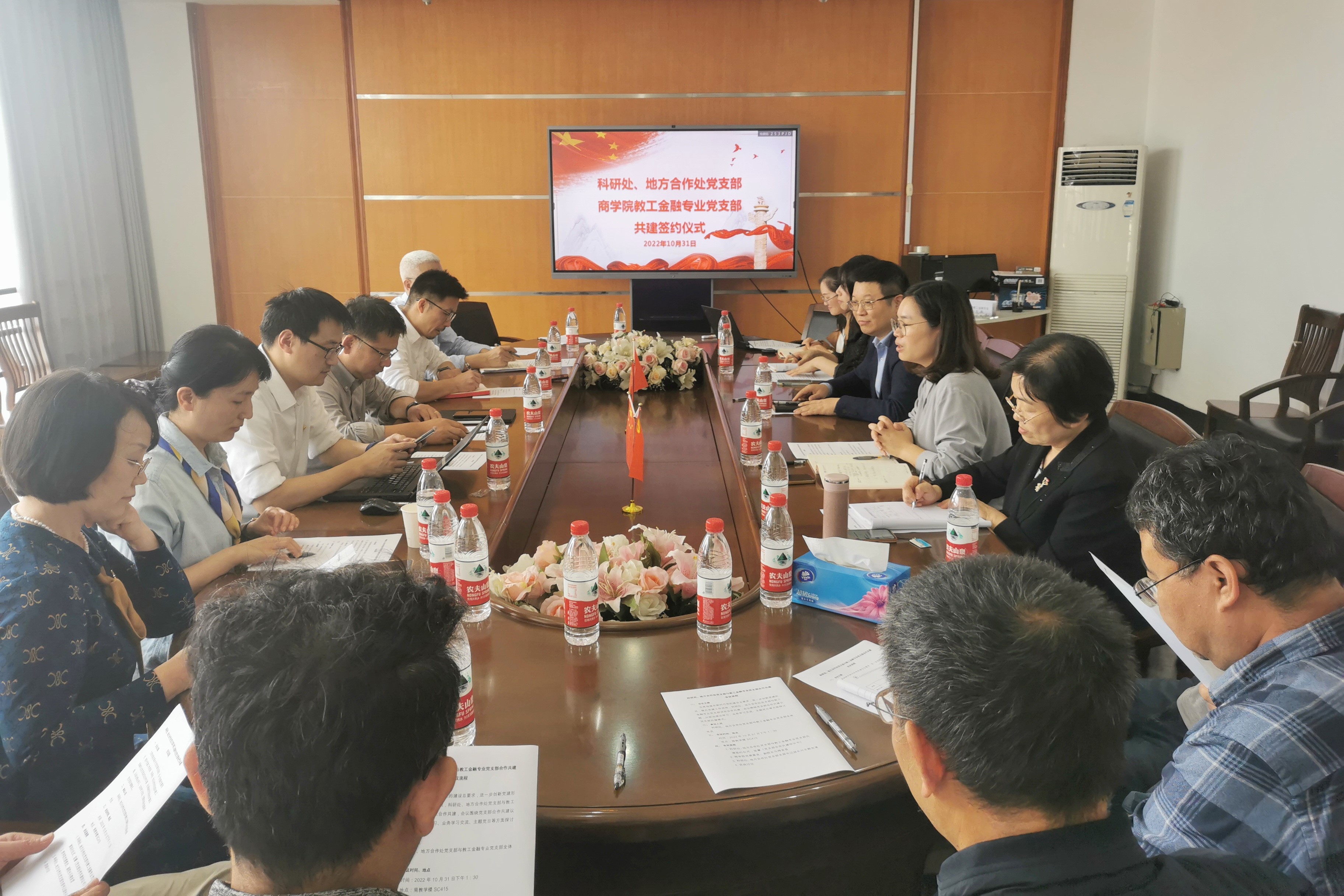为深入学习贯彻党的二十大精神,进一步创新党建形式,提升党建工作成效,10月31日,科研处、地方合作处党支部与商学院教工金融专业党支部在SC415举行结对共建签约仪式。双方约定以“思想领航、交流互鉴、共享共建”三方面内容为着力点,探索构建优势互补、资源共享的党建共建长效机制。