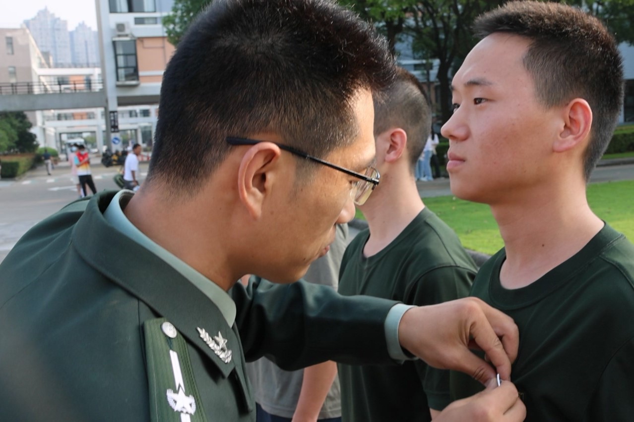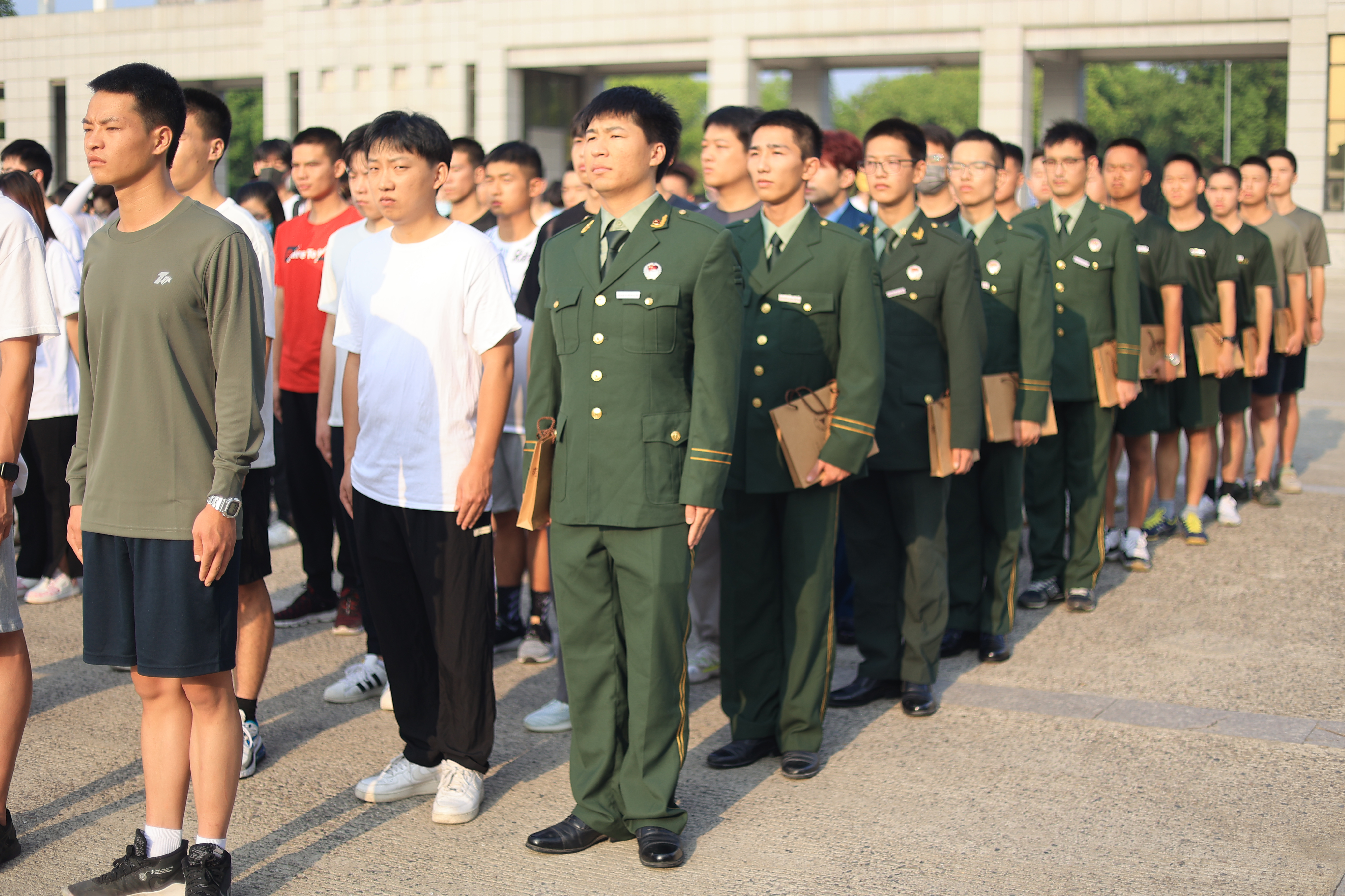 升旗结束后,学校举行欢迎新入学退伍大学生仪式,今年共有55名专升本退伍大学生和20余名服役结束返校大学生重新入学。应中元、周春晓为新入学退伍大学生代表佩戴校徽、分发纪念品,寄语所有退伍大学生们在崭新的学习生活中继往开来,学业有成。