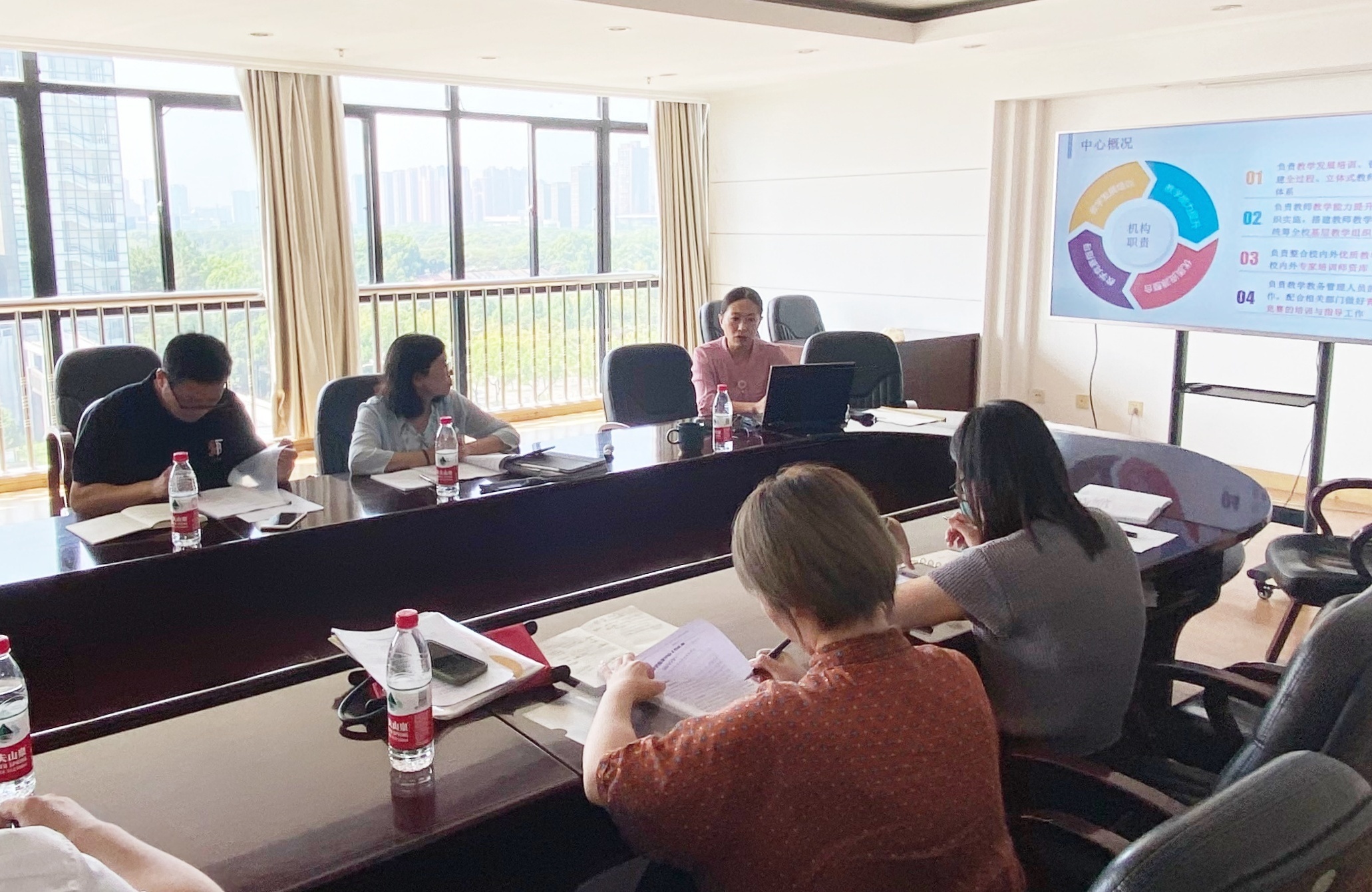 教务处主管、教师教学发展中心工作人员徐晓红就学校教发中心概况、工作进展和建设思路等方面进行汇报。教发中心秉承为教师教学发展服务的宗旨,聚焦教学能力提升,设计系统培训项目,引进优质培训资源,深化课堂教学创新,鼓励教师以赛促教。教发中心成立四年来,创建了“名师有约”“匠人工坊”“在线课堂”“好书推荐”“教务读书会”等培训品牌,举办各类线上线下培训140余场,累计培训5400余人次,深受广大教师好评。