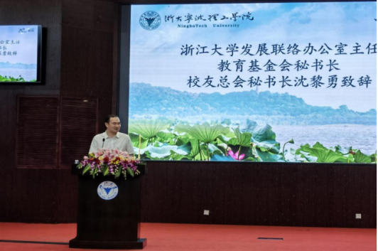 浙江大学发展联络办主任、校友总会秘书长、教育基金会秘书长沈黎勇老师代表浙江大学校友总会向浙大宁波理工学院杭州校友会的成立表示热烈的祝贺,浙江大学与浙大宁波理工学院同根同源,欢迎浙大宁波理工学院的校友融入浙大校友的大家庭,抱团取暖,共享资源。
