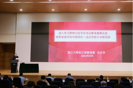 浙江大学化学工程与生物工程学院党委书记、副院长沈文华应邀作《深入学习贯彻习近平总书记教育重要论述感恩奋进开创中国特色一流应用型大学新局面》专题报告。从战略视野、内容体系、重大意义三个方面深入解读习近平总书记教育重要论述,强调始终站在“百年未有之大变局”的世界视野下看教育,始终联系“中华民族伟大复兴”的战略全局看教育,始终抓住教育的根本问题来思考教育,牢牢把握“九个坚持”,聚焦“为谁培养人”“培养什么人”“怎样培养人”的关键问题,全面理解“党之大计”,加强基层党建,重视教育的全面发展,扎根中国大地办教育,深刻把握习近平总书记教育重要论述的丰富内涵和重大意义。