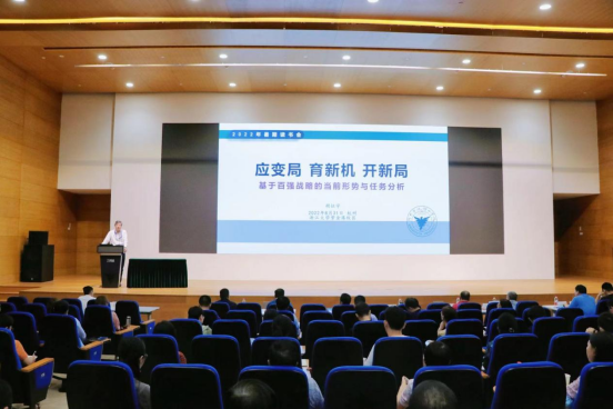 校党委书记胡征宇作“应变局、育新机、开新局”主题讲话,深入分析面临的形势挑战,全面解读应对的总体策略,紧密部署当前的任务要求。胡征宇指出,我们要准确把握全球高等教育多样化、跨学科和可持续的发展趋势,科学分析我国地方高校特色兴校、快速发展的总体态势,清醒认识我校的现状基础、优势不足、发展挑战,在办学定位和目标不变、形势动态瞬息万变之间找准平衡点、切入点、突破点,增强主动、积极、合力应对的意识和能力。他强调,面对变局谋发展要牢牢坚持“省内一流、全国百强”的战略定力,坚持“人才培养全链条”的生态体系,坚持“立足宁波、依托浙大、放眼全球”的发展思路,坚持“问题、目标、结果”相统一协调的发展导向,坚持“人才立校、创新强校、特色兴校”的发展路径,坚持“以院办校、院为实体”的管理体制改革方向,坚持“有所为有所不为”的资源统筹配置策略,坚持“党建带学科”双轮驱动发展,促进育人工作高质量发展,推进学科建设交叉融合,融入区域战略着力聚合资源,加强党建助推活力发展,在汇聚“众人拾柴”的强大合力、保持“咬定青山”的不懈韧劲、筑牢“中流击水”的顽强意志、坚定“志在必得”的信心决心中,求是图强、求实图兴、求新图进,以优异成绩迎接党的二十大胜利召开。