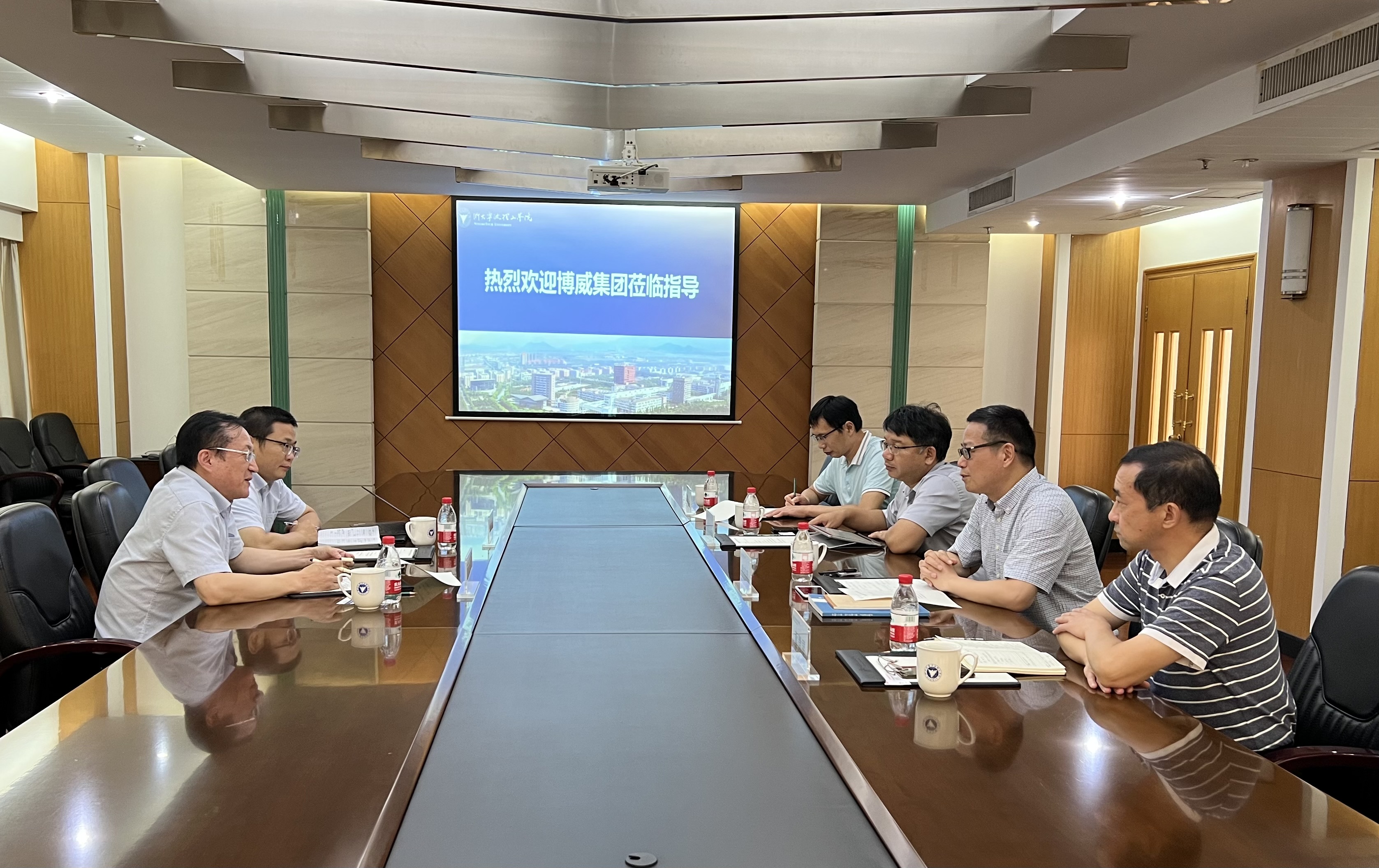 8月19日下午,博威集团战略与品牌负责人周宏渤,集团品牌推广经理李攀一行来我校交流洽谈合作事宜。学校副校长鲁东明,科研处处长胡长兴,机能学院党委书记童微星,机能学院机械系副主任李继强及相关人员参加了会议。