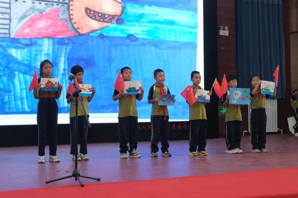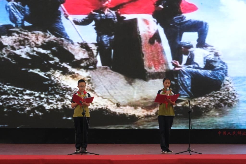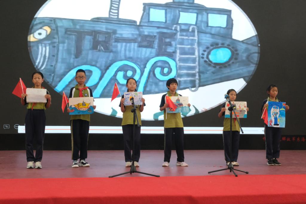 “满灯的星辰镶嵌在夜阑,人民海军的精神永远不眠,先锋猛虎海空雄鹰,核潜航母逐浪滔天,亚丁湾奔涌着大国风采,和平崛起铸剑深蓝……”孩子们声情并茂、慷慨激昂。他们深情地朗诵,把优美的文字化为生动的话,表达对人民海军的崇敬之情。
