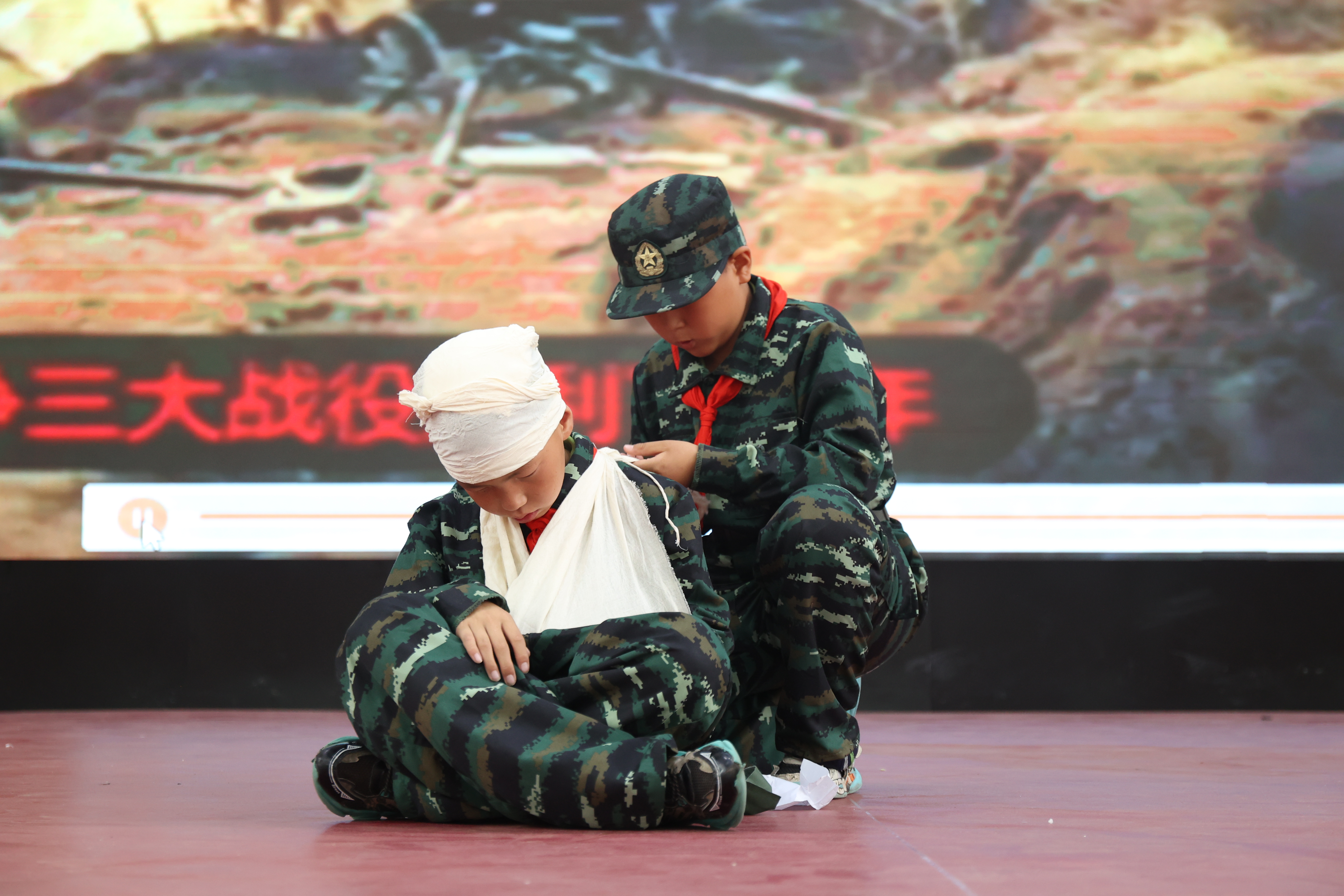 “迷彩知行”战地医疗救护包扎展示环节中,小朋友们扮演医疗兵模拟在战争情况下救治伤员,严谨的求助流程,专业的头部包扎和手臂大悬臂带包扎步骤,赢得在场所有人的鼓掌和赞美声。