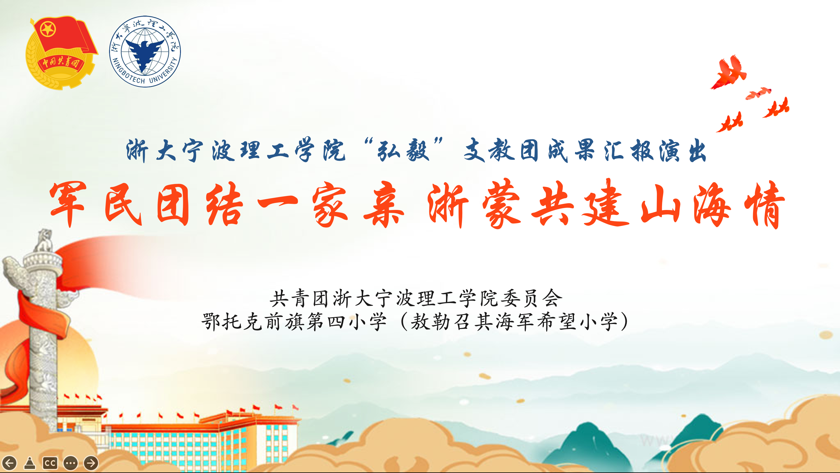 7月15日,浙大宁波理工学院“弘毅”支教团在内蒙古鄂托克前旗第四小学(敖勒召其海军希望小学)举行以“军民团结一家亲,浙蒙共建山海情“为主题的汇报演出,展现实践成果,为此次支教画下完美的句号。