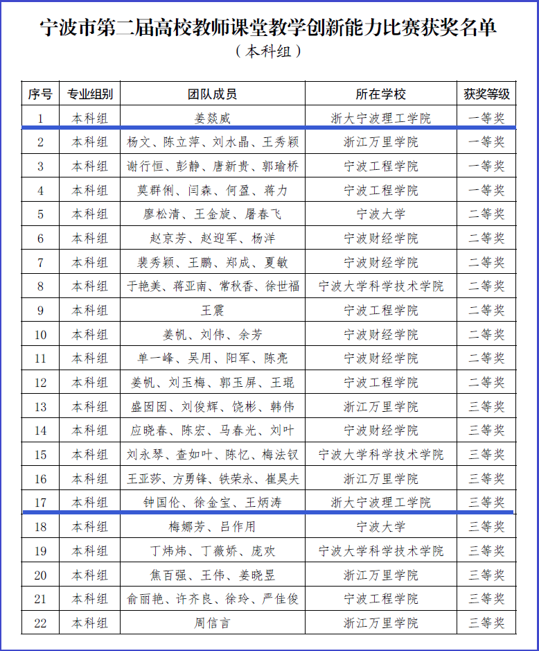 图4. 宁波市第二届高校教师课堂教学创新能力比赛获奖名单(本科组)