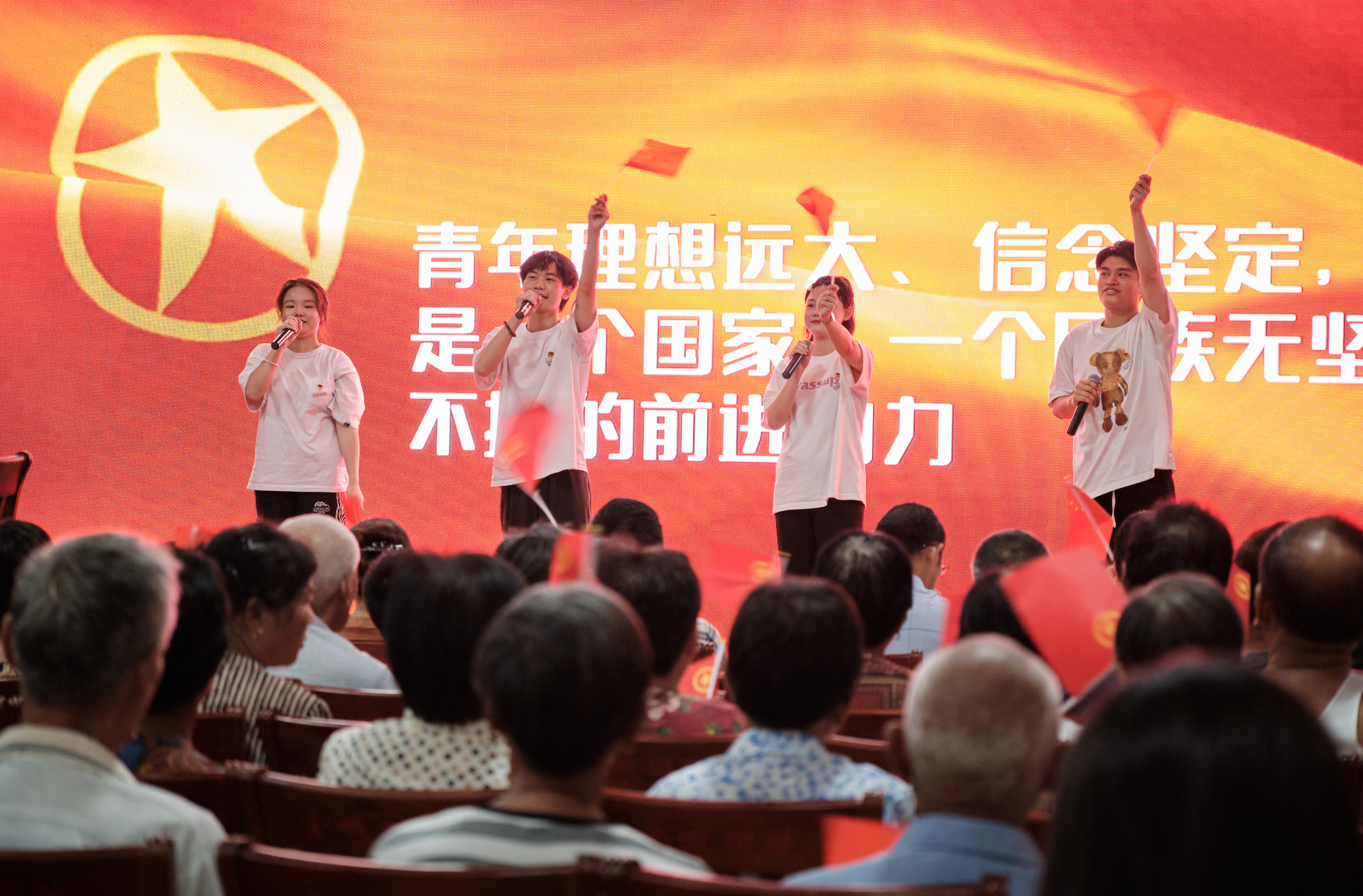 “红色的精神灌注在灵魂,红色的血液流淌满全身,青年的力量是祖国的先锋,共青团员是我自豪的身份”“在团旗下,心系大中华,无论我走到哪,团旗永是我方向啊!”冯扣子、万高翔等实践团成员用歌声唱响青春,为金峨村带来原创青春歌曲《你我同行》《在团旗下》,表达了新时代青年坚定跟党走的决心。台下的村民听得津津有味,还不时跟随音乐律动,和着节拍挥动手中的旗帜。
