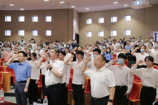 大会在嘹亮的国歌声中拉开序幕。新发展党员代表面对党旗进行庄严的入党宣誓,在场老党员重温入党誓词。