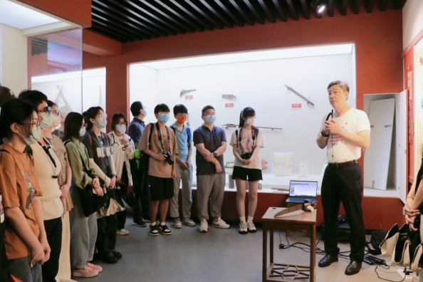 在战争枪械和革命烈士遗物展柜前,师生驻足。胡征宇结合领衔主持的宁波市2025重大专项课题“红色文化综合服务关键技术研究及应用示范”进展情况为大家讲课。对于新时代的青年,走进革命旧址才能更好地走近革命历史,才能更好地汲取奋进力量。他立足开展红色历史教育的重要性和改革思政课实践教学形式的必要性,讲述把课程开到四明山抗日根据地进行现场教学的目的与初衷。他讲到,在信息技术不断发展的今天,在疫情影响无法亲赴旧址现场的客观现实面前,学校数字化技术团队开展联合攻关,正在将革命旧址的空间和文化通过数字虚拟化技术搬到网上云端,用数字赋能,赓续红色血脉,为丰富教育教学拓展了新途径。一代人有一代人的成长环境。他希望,同学们在新的时代条件下,主动学习历史、深刻铭记历史,守好红色根脉,在伟大复兴的赛道上跑出好成绩。