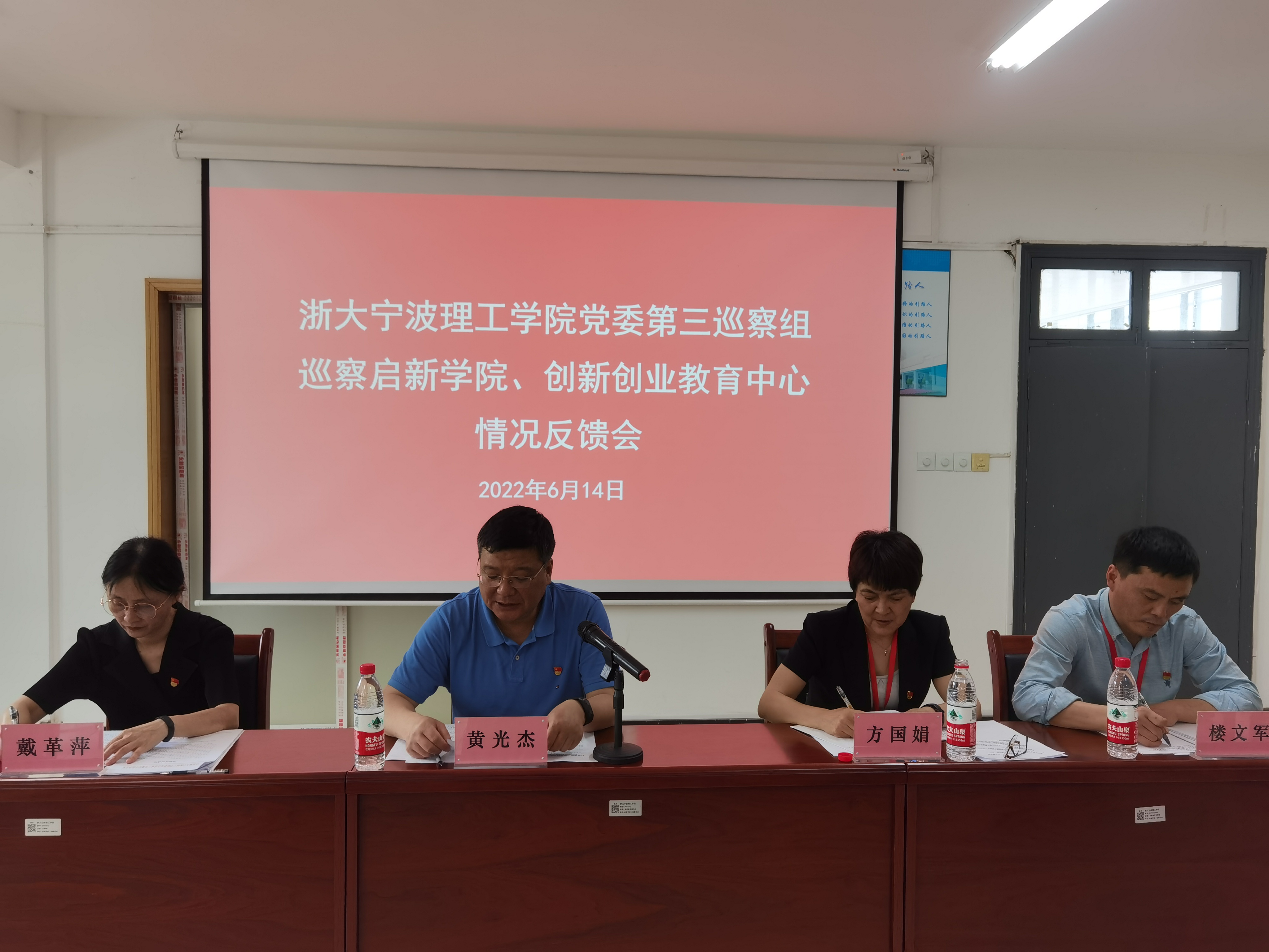 6月14日,学校党委第三巡察组巡察启新学院、创新创业教育中心情况反馈会在游泳馆201-1会议室召开。学校党委委员、纪委书记、巡察工作领导小组副组长黄光杰,第三巡察组组长方国娟、副组长楼文军,巡察办相关人员,启新学院、创新创业教育中心全体教职工参加反馈会。反馈会由启新学院院长兼创新创业教育中心主任戴革萍主持。