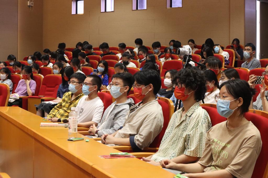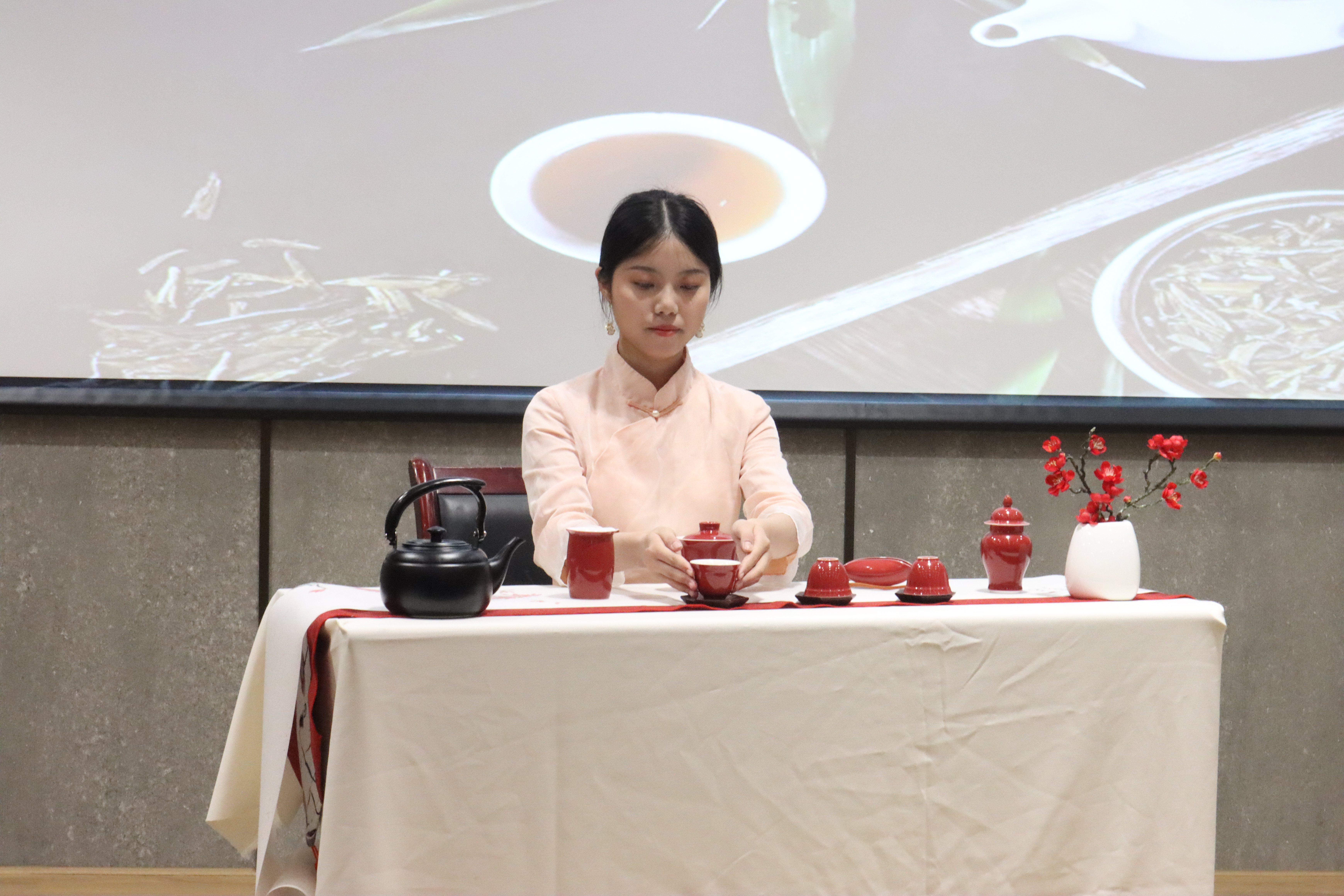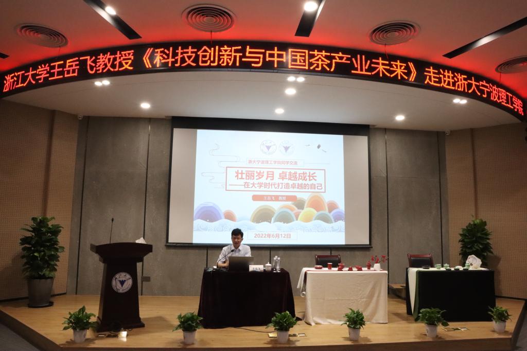 王岳飞教授以浙江大学“历史悠久,底蕴深厚”的茶学专业导入,做《科技创新与中国茶产业未来》主题报告。他从“中国茶,冠世界”“茶性廉,和天下”“知茶性,成分珍”“喝茶健,寿众生”“辩体质,科学饮”“科技新,茶未来”六大板块详细阐述了“茶产业、茶文化、茶科技、茶健康、茶生活、茶产品”内容,让同学们深入了解了国内外茶产业发展现状、茶的起源及茶文化影响力、茶叶科技与产品开发研究进展、茶叶健康及保健作用研究进展以及如何科学健康饮茶。此次讲座,王岳飞教授不但讲授了茶文化的知识,还从立德树人的角度分享了作为“学生最喜爱的班主任”中的工作经历,勉励同学们要保持健康向上的生活习惯,在青春的年华里矢志奋斗、茁壮成长。讲座最后,来自浙江大学茶艺队的三朵“茶花”,现场为师生进行了茶艺表演,在古韵十足的伴奏声中,大家近距离感受了茶艺的优美和茶道的内涵。