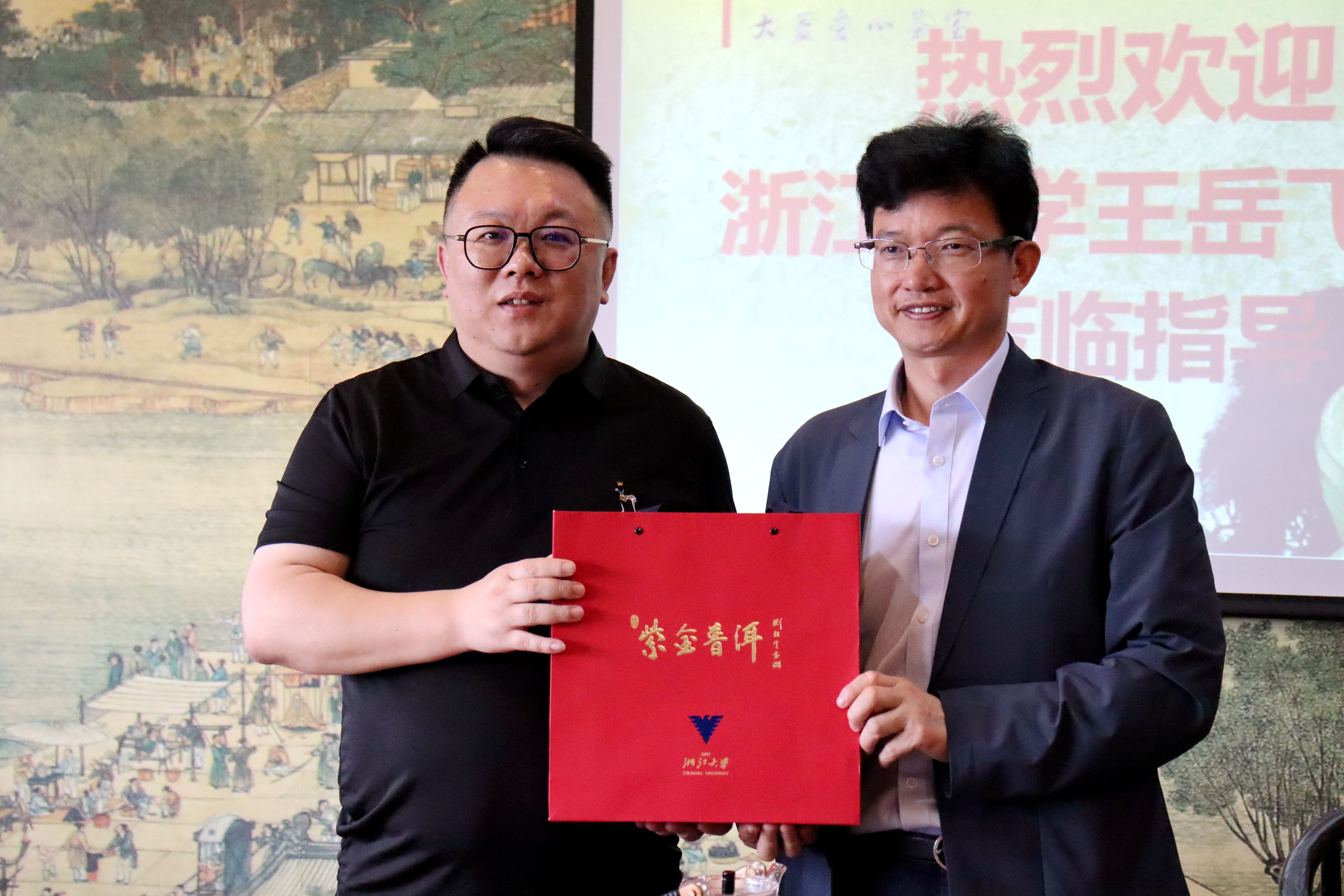 6月12日上午,王岳飞教授一行来到学校大益茶室与热爱茶文化的师生座谈交流。王岳飞教授讲述了从事茶文化研究的个人历程,对学校如果做好茶文化的传播提出了中肯的建议,并赠送给大益茶室由浙江大学与云南景东县共同开发的扶贫产品“紫金普洱”茶饼。大益茶室指导教师王一程接受了赠送的茶饼,并对王岳飞教授对茶室运行和茶文化传播提出的宝贵意见表示感谢。