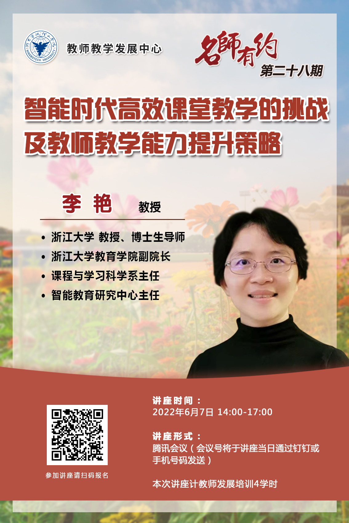 为帮助广大教师更好地理解学校“以服务师生为宗旨、建设教学数字化共同体”理念,积极参与教学数字化改革,推进教学内容、教学资源和教学方法的数字化转型,提升智慧教学设计和实施能力,6月7日下午,浙江大学教育学院李艳教授应邀做客第二十八期“名师有约”。本场讲座主题为“智能时代高效课堂教学的挑战及教师教学能力提升策略”,近百位教师通过腾讯会议参加学习。讲座由教务处处长、教师教学发展中心主任沈昊宇教授主持。
