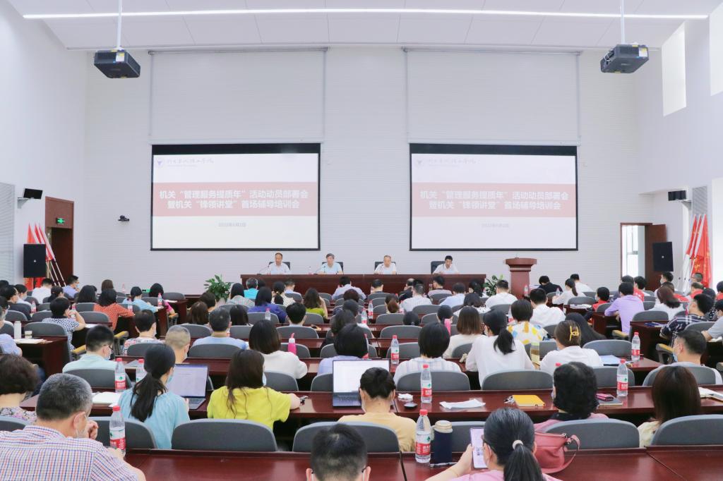 6月2日下午,学校在学术交流中心1号楼404-405召开全校机关“管理服务提质年”活动动员部署会暨机关“锋领讲堂”首场辅导培训会。学校党委书记胡征宇,学校党委副书记、机关“管理服务提质年”活动领导小组组长李凤旺、冯建波,学校机关全体行政人员,学院全体副主管以上干部参加会议。学校党委委员、组织部部长、机关党委书记周树红主持会议。