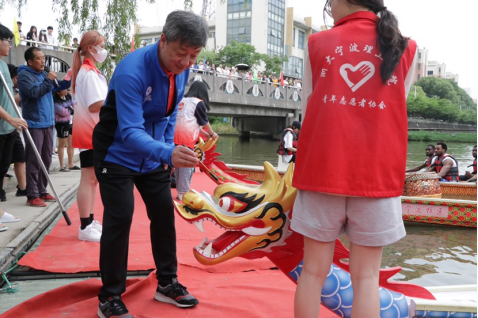 胡征宇、鲁东明、单世涛、世界残奥会赛艇冠军龙舟队总教练黄成用朱砂为赛用龙舟“画龙点睛”,并寄语各龙舟代表队发扬比赛精神,赛出水平、赛出风格、赛出友谊。