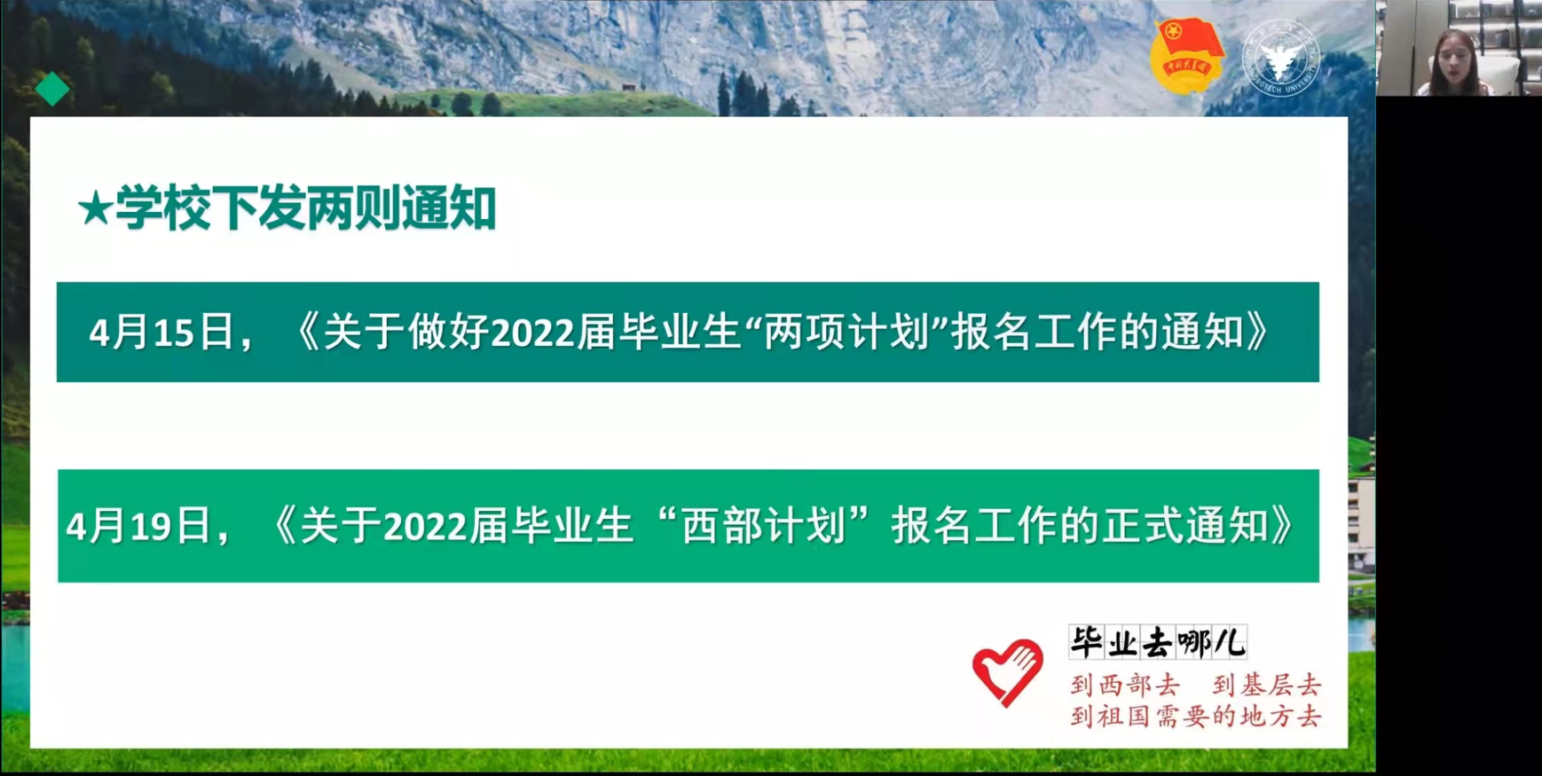 会上,陈艳对2022年“两项计划”的具体内容、报名条件、招募流程、政策待遇、学校关怀等进行详细解读,重点强调了《2022-2023年度大学生志愿服务西部计划实施方案》中的注意事项和关键内容。她结合去年7月带着13名学生赴西藏体悟国情、寻访校友的亲身经历,勉励大家“人生,有一万种可能。因为年轻,所以无所不能!到西部去、到基层去、到祖国和人民最需要的地方去,这不仅仅是一句口号,更是生命岁月中镌刻下的青春记忆!”