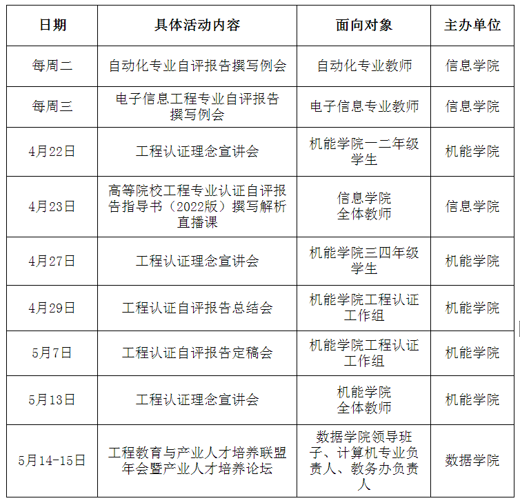 根据前期工作安排,下一阶段学校将以学院为主体,紧扣时间表,持续开展“工程教育专业认证”系列活动,大力推进工程教育专业认证过程管理工作,力争迎评专业一次性通过专业认证,助推我校建设“省内一流,全国百强”高水平创新性应用型大学。