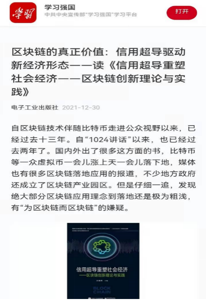 近日,中宣部“学习强国”学习平台大篇幅推介电子工业出版社撰写的“区块链的真正价值:信用超导驱动新经济形态——读《信用超导重塑社会经济——区块链创新理论与实践》”一文。该文章介绍的著作《信用超导重塑社会经济——区块链创新理论与实践》是由浙江大学教授、我校启新学者讲座教授、网络空间治理与数字经济法治(长三角)研究基地主任兼首席专家王春晖教授主编,电子工业出版社出版的。