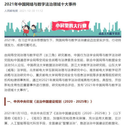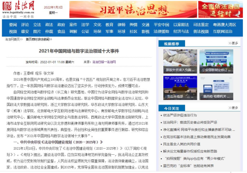 2021年是中国共产党成立100周年,也是实施“十四五”规划的开局之年。在习近平法治思想指引下,这一年我国网络与数字法治建设迈出了坚实步伐,行动持续发力,成绩可圈可点。近日,法治日报、法治网、人民邮电报等中央媒体全文报道由网络空间治理与数字经济(长三角)研究基地、中国行为法学会网络与数字法治研究院和中国通信学会网络空间安全战略与法律委员会发起,联合中国网络与数据安全法治50人论坛、中国政法大学数据法治研究院、浙江大学数字法治研究院、华东政法大学数字法治研究院、山东大学(威海)法学院、北京邮电大学互联网治理与法律研究中心、南京邮电大学数字经济战略与法治研究中心、重庆邮电大学网络空间安全与信息法学院、西南政法大学中国信息法制研究所、上海市法学会互联网司法研究会以及北京德和衡律师事务所和上海光明律师事务所,通过对2021年度网络与数字法治领域具有代表性、典型性、开创性和全局性的重要事件进行跟踪、研究和综合评估,发布的“2021年中国网络与数字法治领域十大事件”。