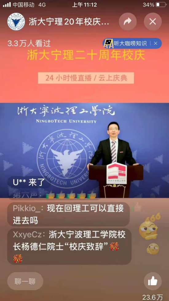 在上午的直播中,学校党委书记胡征宇宣读了浙江省委常委、宁波市委书记彭佳学对校庆二十周年的寄语,以及浙江大学的贺信。