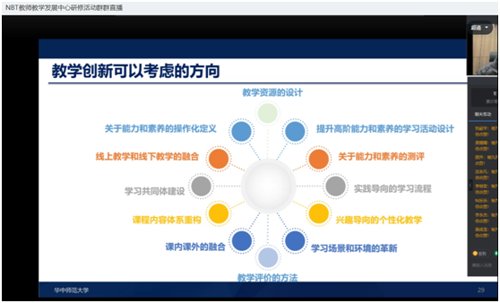 为提升我校教师信息化教学水平,加强教师教学设计与创新能力,12月16日下午,教师教学发展中心邀请了华中师范大学杨九民教授,通过钉钉直播做了一场“信息化环境下的教学设计与实践”专题讲座。本次讲座是学校“名师有约”系列讲座的第二十六讲, 140余位教师观看直播。