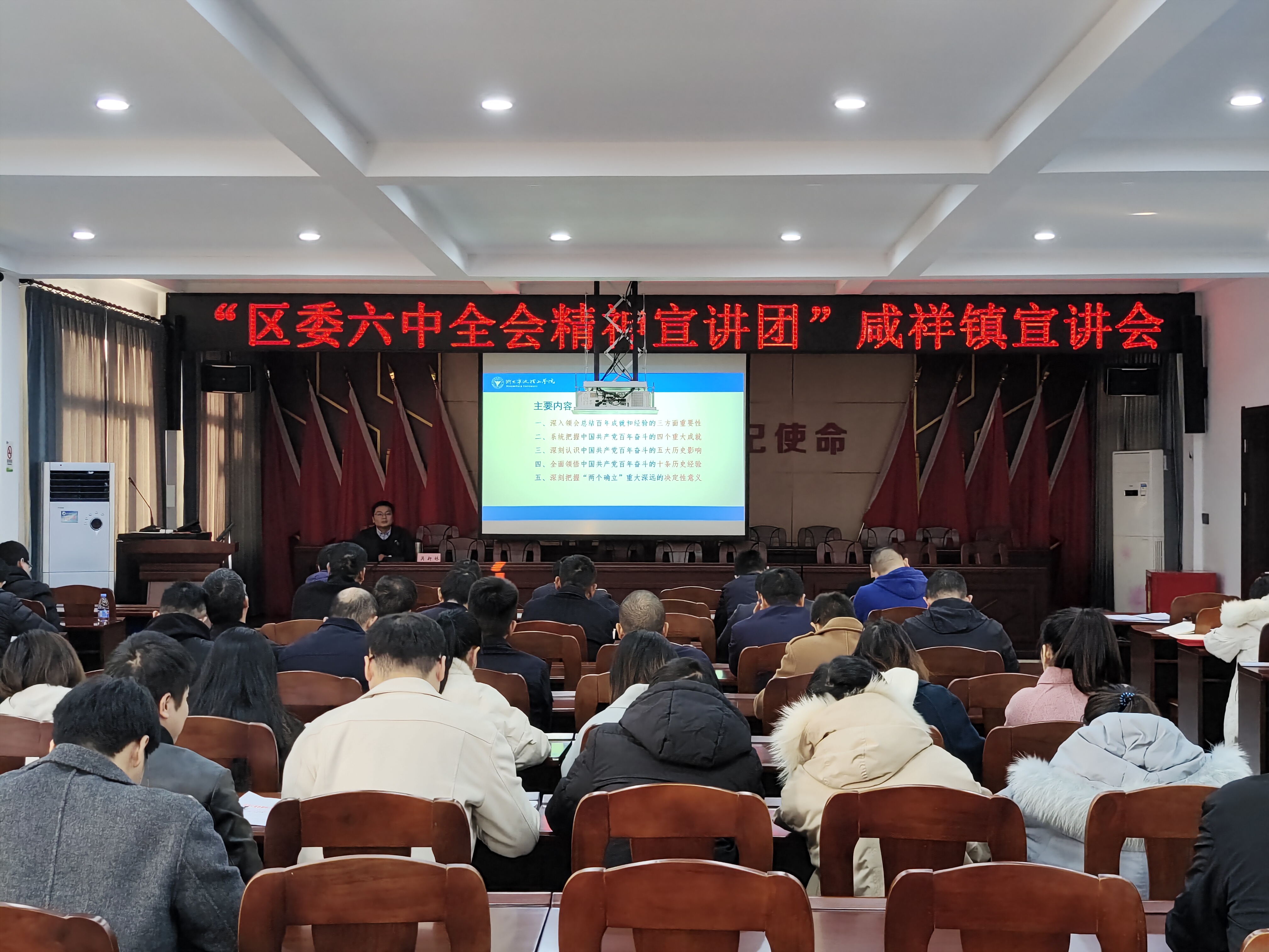 开展理论宣讲是马克思主义学院是重要职能。党的十九届六中全会胜利闭幕后,随着全会公报、《中共中央关于党的百年奋斗重大成就和历史经验的决议》和习近平总书记关于《决议》的说明的发布,马克思主义学院迅速组织教师先学一步,做好准备,积极响应学校及市区县街镇对党的最新理论成果的宣讲需求。吴新林老师应邀承担了鄞州区委六中全会精神宣讲团咸祥镇宣讲会首场报告,把“六讲六做”落到了实处。