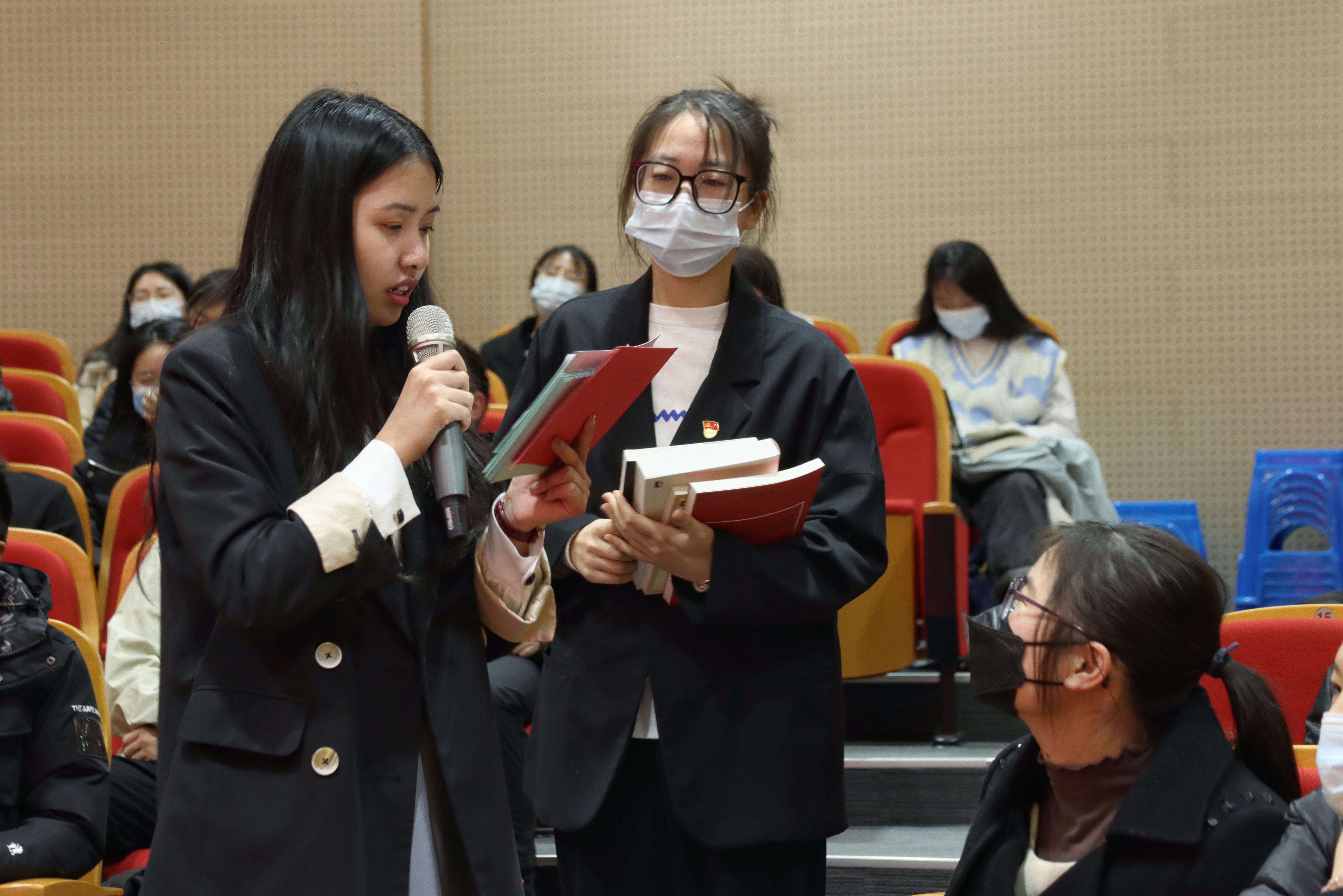 竞赛中,参赛队员冷静思考、沉着应战,比赛高潮迭起、精彩纷呈,赢得了现场观众的热烈掌声。比赛还特地设置了观众竞答环节,围绕“党史学习”“十九届六中全会”“书香宁波”“校史校情”等主题与现场观众互动。