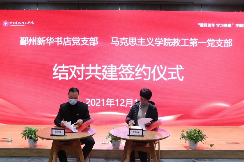 比赛现场还举行了浙大宁波理工学院马克思主义学院教工第一党支部和鄞州新华书店党支部结对共建的签约仪式。