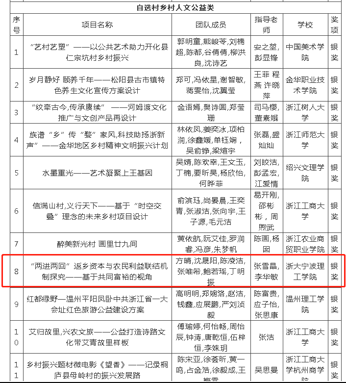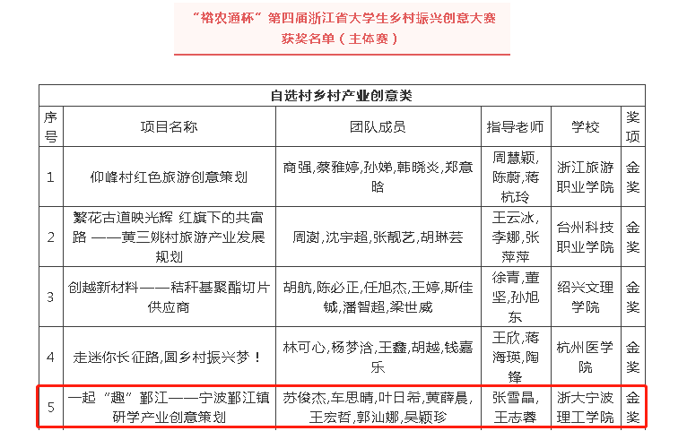 经过激烈角逐,我校选送的2支学生团队脱颖而出,张雪晶、王志蓉两位老师指导的《一起“趣”鄞江——宁波鄞江镇研学产业创意策划》喜获自选村乡村产业创意类金奖,张雪晶、李华敏两位老师指导的《“两进两回”返乡资本与农民利益联结机制探究——基于共同富裕的视角》喜获自选村乡村人文公益类银奖。