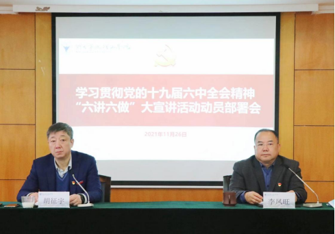 11月26日,学校召开学习贯彻党的十九届六中全会精神“六讲六做”大宣讲活动动员部署会。党委书记胡征宇宣讲六中全会精神并作动员讲话,党委副书记李凤旺主持会议并通报大宣讲活动总体安排。校党政领导班子成员,各院级党组织负责人,各部门单位负责人,党支部书记、师生党员、党外人士代表等参加动员部署会。