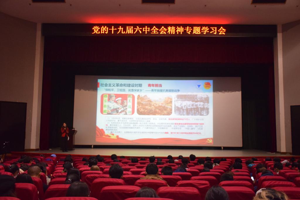 为深入学习贯彻党的十九届六中全会精神,扎实推进党史学习教育,引导学生在百年党史学习中汲取青春奋斗力量,11月21日晚,学校团委业务副主管陈艳老师为250余名校级学生干部带来《从奋斗百年路中汲取青春力量,在启航新征程中绽放青春光芒——党的十九届六中全会精神专题学习会》报告。