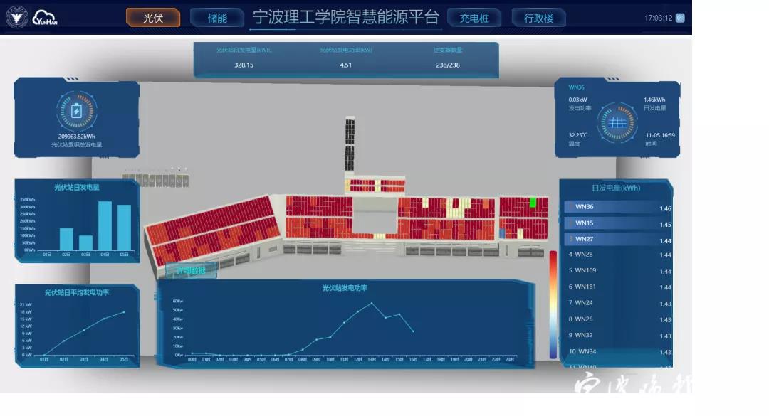 更叫人惊叹的是,这里的1132块一体化光伏板,每块都植入了芯片,各项数据纳入浙大宁波理工学院的智慧能源平台,对光伏发电、储能、充电、用能进行可视化、智能化管控。该示范项目自投用以来,半年累计光伏总发电量为20739.6千瓦时。如有需要,还可进一步调取每一天、每一时,甚至每一块光伏板的工作效率。