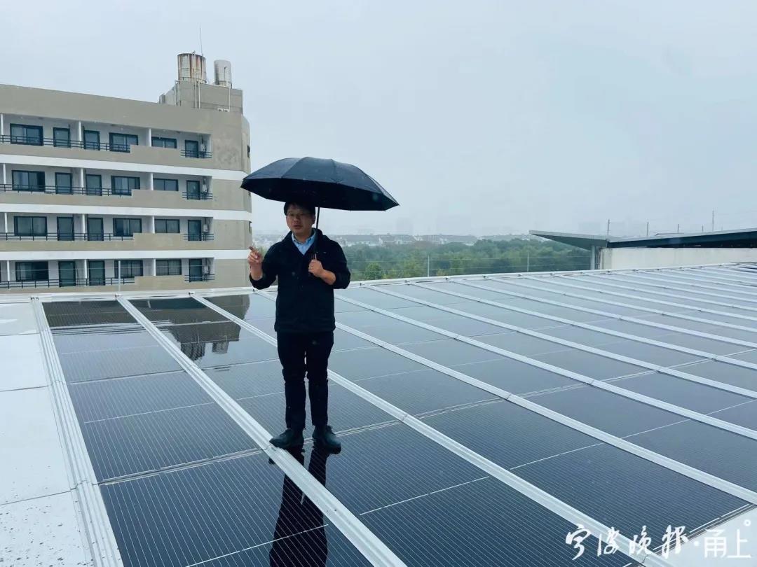 一个下雨天,记者爬上了浙大宁波理工学院机电与能源工程学院通用实验楼的顶层。以前大楼建造时的露台“留白”,现在撑起了整片的光伏屋顶。尽管外面风急雨斜,但走进光伏屋顶下,只听见一旁的雨水集纳管道汩汩奔涌,地面干爽,没有一滴雨水落下。