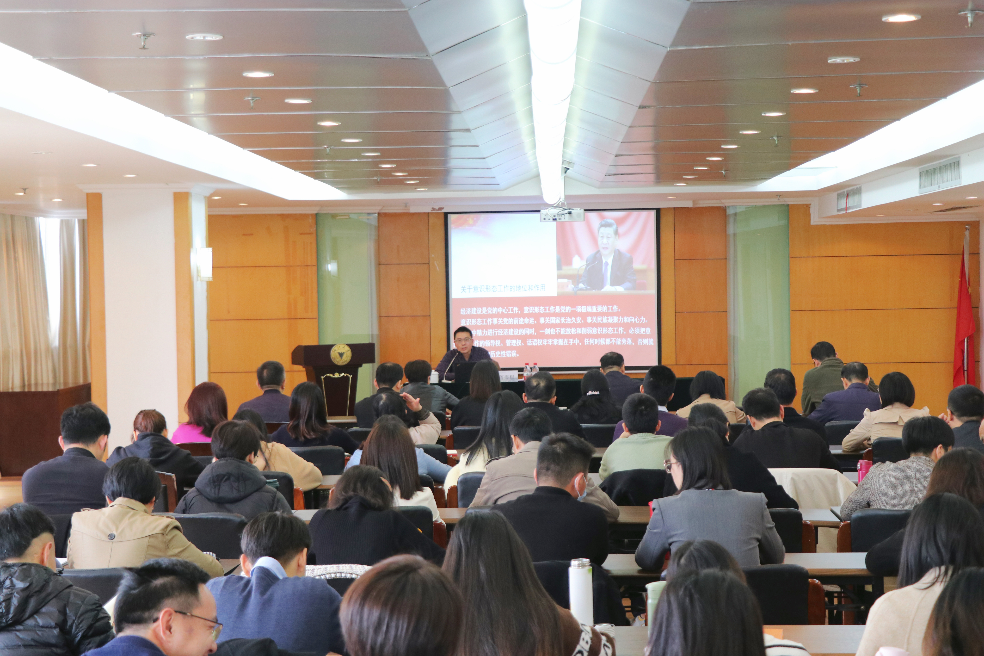为深入学习贯彻习近平总书记关于意识形态和宣传思想文化工作的重要论述,增强学校思政教育和宣传舆论工作针对性,11月16日下午,学校邀请市委宣传部意识形态工作责任制督查室主任蒋委根来校作《强化政治担当落实好意识形态工作责任制》专题辅导报告。学校党委副书记冯建波,以及各院级党组织书记、副书记,学院党政办主任、全体辅导员,党委相关部门人员参加学习,宣传部常务副部长李炜主持培训会。